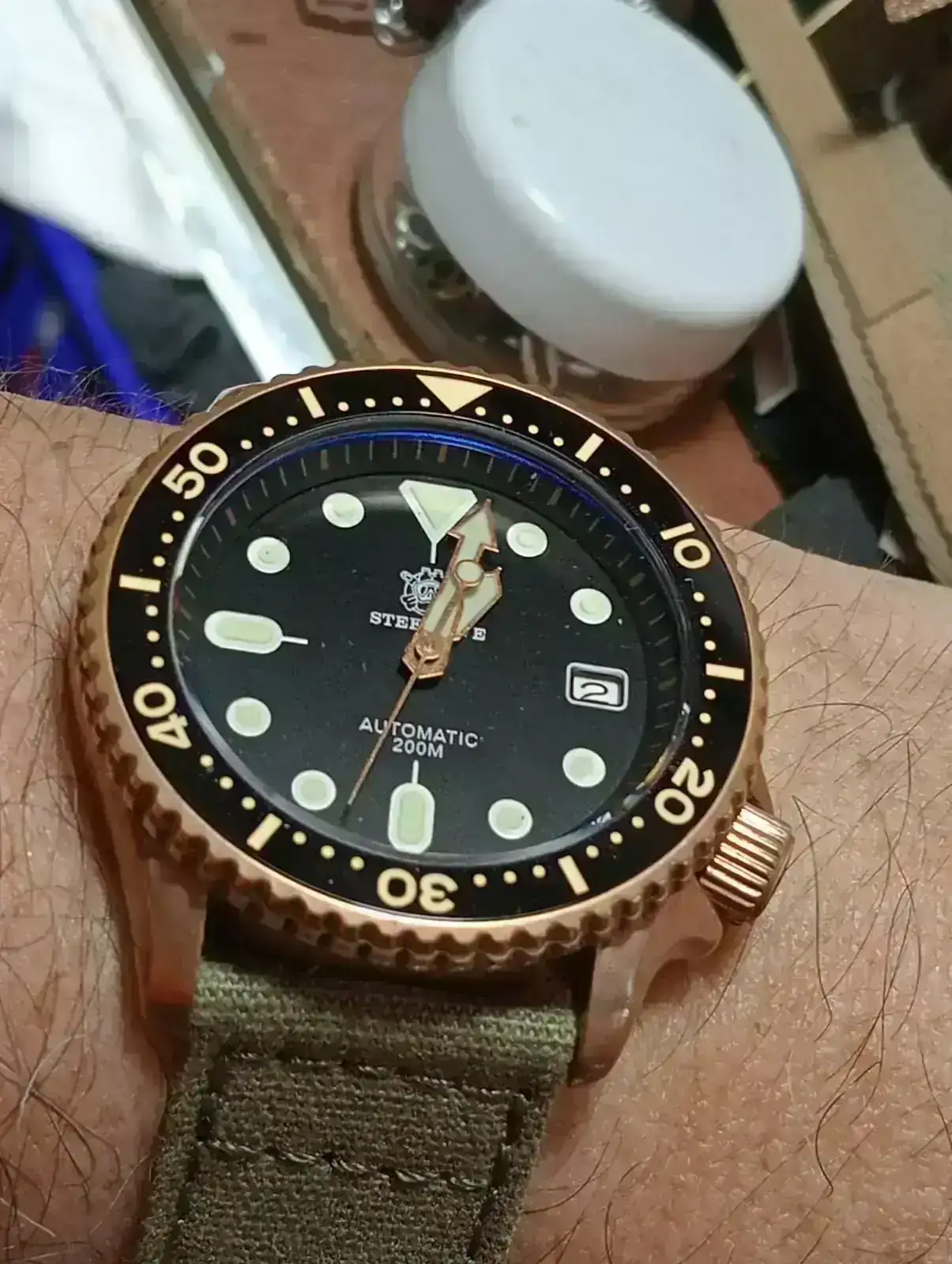 Al poco tiempo me hice con este Steeldive, lo he usado en ducha, mar y piscina y cero problemas, el tuyo tiene una patina muy bonita, en algun lado leí que la patina depende mucho del PH de la piel , pues el mio le he dado uso intenso y vivo a cien metros de la costa y no tiene esa patina tan lograda como el tuyo.