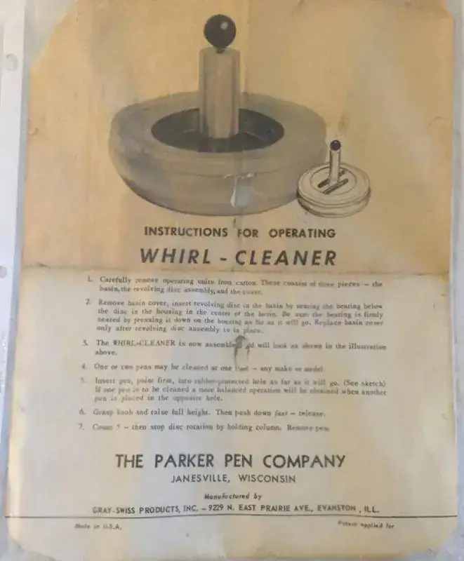Para finalizar este lote, este curioso artefacto denominado Whirl, destinado a la limpieza de las plumas, cuyo sistema se basa en el centrifugado para la evacuación de los restos de tinta de la pieza. Admite dos unidades de cada vez.