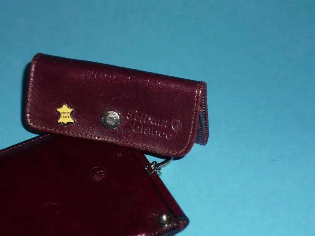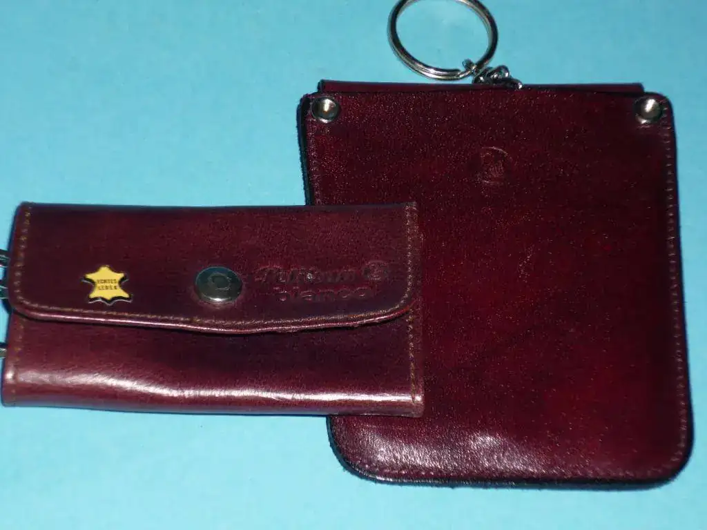 Monedero y bolsa-llavero realizados en cuero marrón con logotipos grabados. Fuente: ebay.