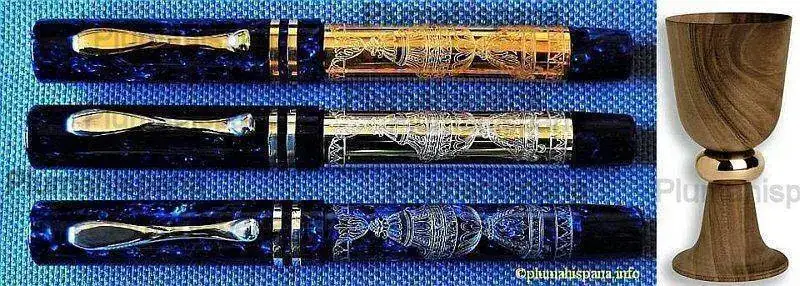 La serie SANTO GRIAL de la firma Safety Pens (actualmente Kinsey) ofrecía este set con las tres versiones integrantes acompañado de un cáliz de madera de nogal y bronce, realizado por el artesano Felipe González Cuéllar especialmente para la ocasión.