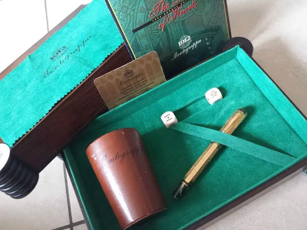 La edición limitada anual de 1999 de la pluma MONTEGRAPPA QUEEN OF HEARTS, realizada en celuloide con camisa de oro de 18 kt grabada, llevaba como obsequio un cubilete forrado en piel y dados de póker, todo ello en una caja con motivos alusivos al juego y forrada con tapete verde de filetro.