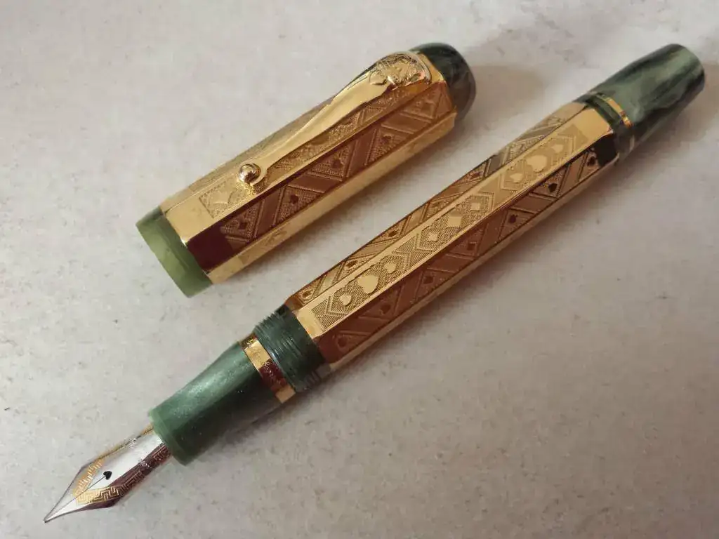 Las plumas estaban fabricadas por la casa italiana Visconti en resina acriloide marmoleada, estando dos de ellas acabadas con camisa “overlay”, en plata y en oro, todas ellas en una tirada muy corta de ejemplares.