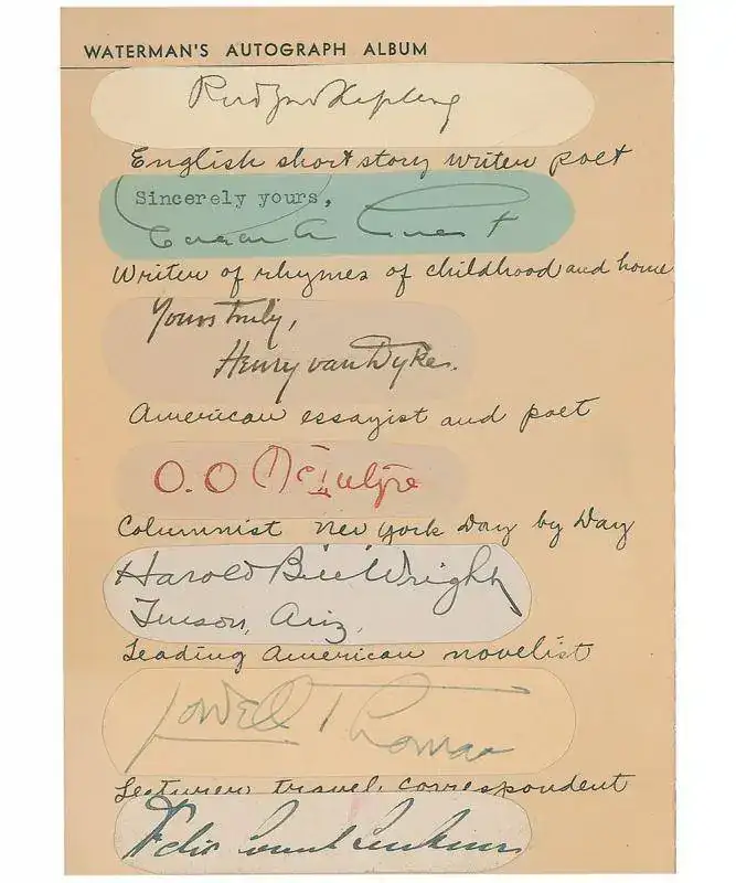 Donde también se hace referencia a la siguiente bibliografía "The Story of a Waterman's Autograph Book" by Melissa Lowry, "The PENnant" vol. XVI, No.1, Spring 2002.