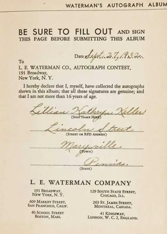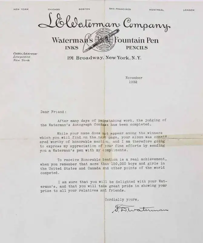 Durante seis meses a comienzos de la década de 1930, en concreto desde el 1 de abril al 1 de octubre de 1932, la compañía Waterman lanzó un concurso dirigido a todos los escolares del país. Cada participante debía llenar un álbum de autógrafos editado expresamente por Waterman para la ocasión, con firmas de personajes notables de la época y enviarlo a la compañía para participar en el concurso. Se otorgaron una serie de 333 premios, desde el primer premio que estaba dotado con 1000 dólares, 132 premios en efectivo de cuantía menor detallados más abajo, 100 estilográficas (Lady Patrician para niñas y modelo 94 para niños) y 100 lápices mecánicos Waterman para los últimos clasificados. El concurso, en plena época de la depresión, fue acogido con entusiasmo y de ahí que se hayan conservado tantos ejemplares.