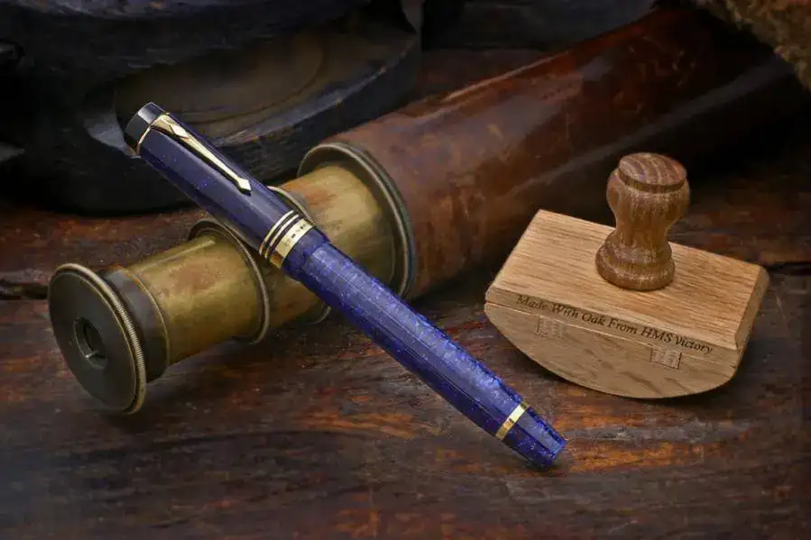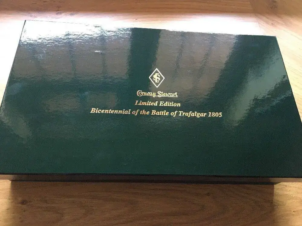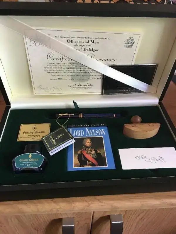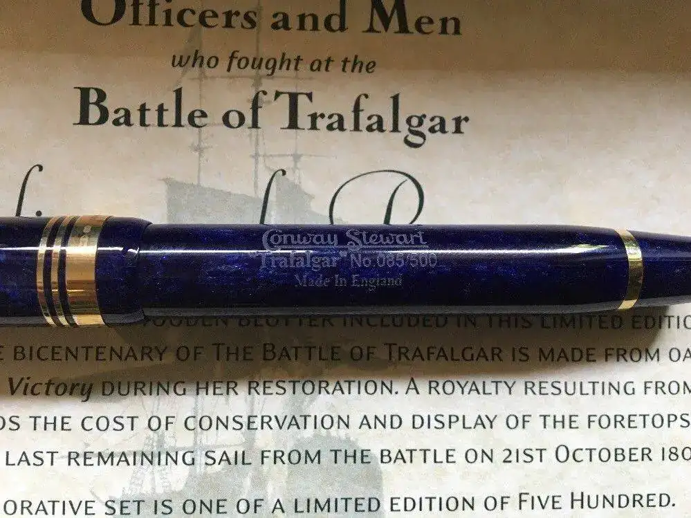 La nueva etapa de esta conocida marca británica ha lanzado numerosas ediciones especiales desde su reactivación. Entre ellas vamos a citar la siguiente, dedicada al bicentenario de la Batalla de Trafalgar, editada en 2005, ya que incluye un soporte de secante realizado con un trozo de madera del HMS Victory, uno de los navíos participantes, junto con un librito que recoge la biografia del Almirante Nelson. Aunque lo cierto es que el acabado y presencia del soporte es bastante mediocre, el resto del conjunto y la propia pluma son de calidad.