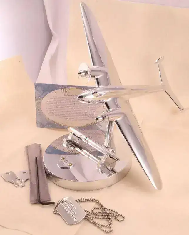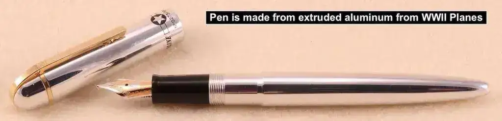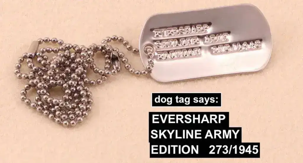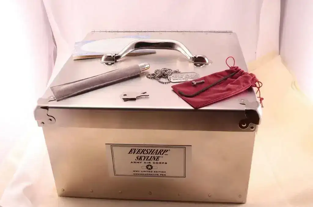 En este caso hablamos de la edición limitada Eversharp Skyline Army, que conmemora la Segunda Guerra Mundial. La pluma va acompañada de un cofre especial, una chapa de estilo militar identificativa de la edición y un soporte de escritorio con un avión de la época. Todo ello, incluyendo la pluma, se ha realizado con aluminio procedente del fuselaje de aviones norteamericanos que participaron en la contienda, según se refleja en el certificado acreditativo.