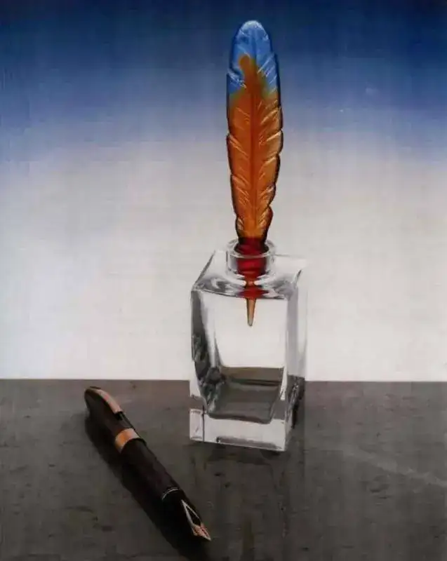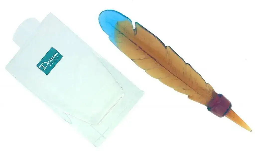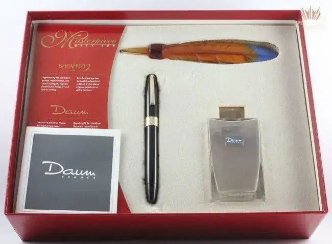 La otra que mencionamos es la Masterpiece Gift Set Daum Edition, limitada y numerada, que incluye un tintero de vidrio en color realizado por la famosa casa francesa. En ello destaca el detalle del tapón del frasco con forma de pluma de ave. Nótese que el tapón es funcional en sí mismo, ya que cuenta con un plumín de vidrio que permite su aplicación como objeto de escritura.