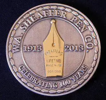 En esta ocasión se muestra uno de esos objetos que recogen la historia de una marca emblemática y que se convierten por sí mismo en un inestimable icono de colección. Se trata de una medalla conmemorativa del centenario de la marca Sheaffer 1913-2013, bellamente realizado, en edición limitada numerada. Desconocemos la distribución que pudo tener este recuerdo, pero dado lo limitado de la tirada, probablemente no saliera de Estados Unidos.