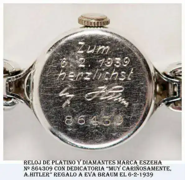 [h=3]El reloj de oro de Hitler, regalo de sus colaboradores en la Navidad de 1929, fue subastado junto a otros objetos personales, a diferencia del reloj de platino y diamantes marca Eszeha que èl obsequio a Eva Braun el 6-2-1929 con la dedicatoria "Muy cariñosamente A. Hitler" y que sus herederos no se atrevieron a reclamar al Gobierno Aleman.
