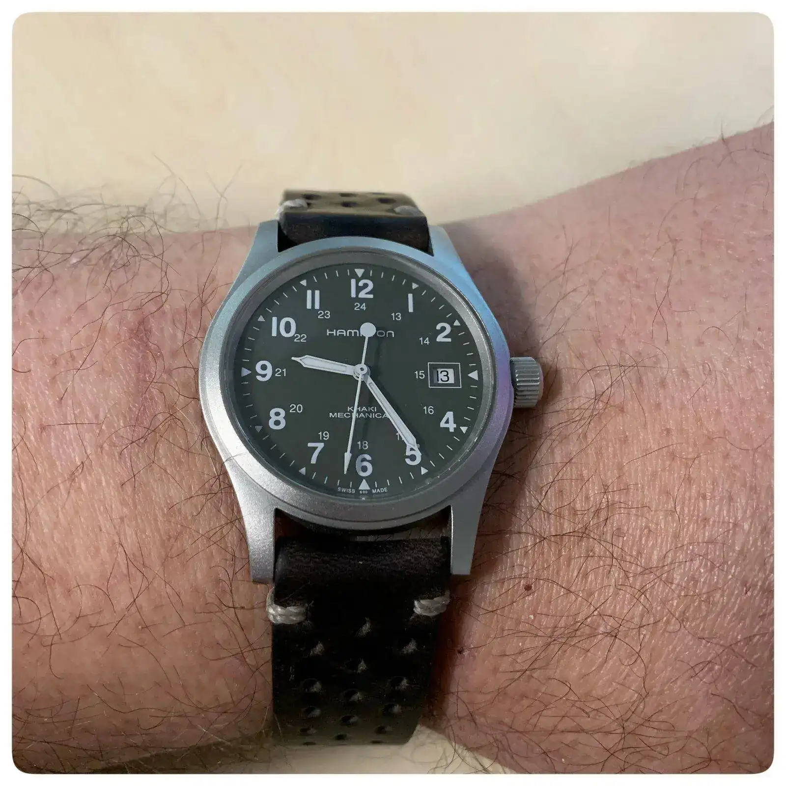 Ante todo, quería presentarme ante vosotros, ya que soy relativamente novato en lo que al mundo de la relojería se refiere. Actualmente, estoy pensando en adquirir un reloj con una estética militar (40-42mm máximo), con un presupuesto de entre 500-700€ aproximadamente y a ser posible automático. De momento estoy enamorado del "Hamilton Khaki Field" que os pongo a continuación, aunque estoy abierto a sugerencias: