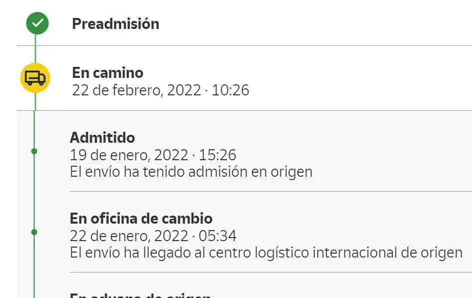 En ADT me sale que está pendiente de salida de sus oficinas con fecha del 9 de febrero y en la página de Correos, que está en camino, con fecha del 8 de febrero.