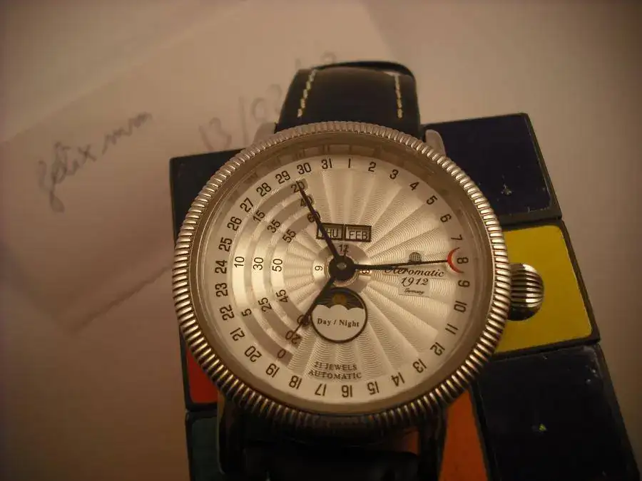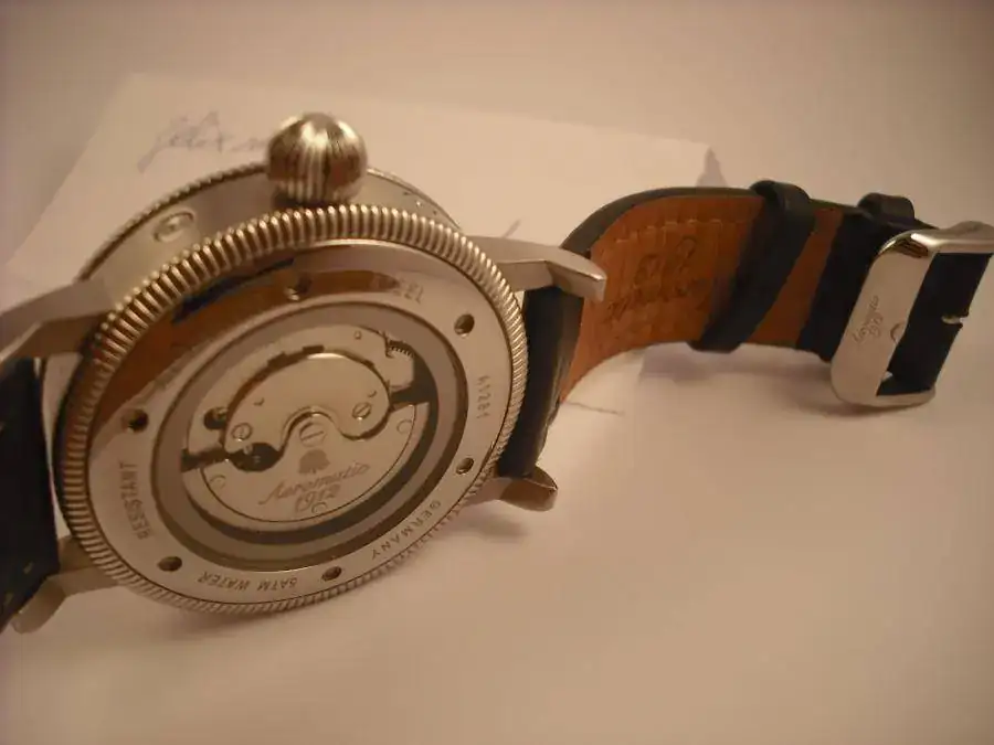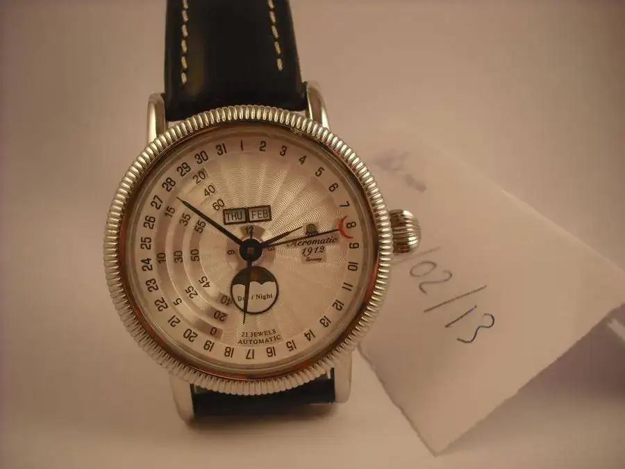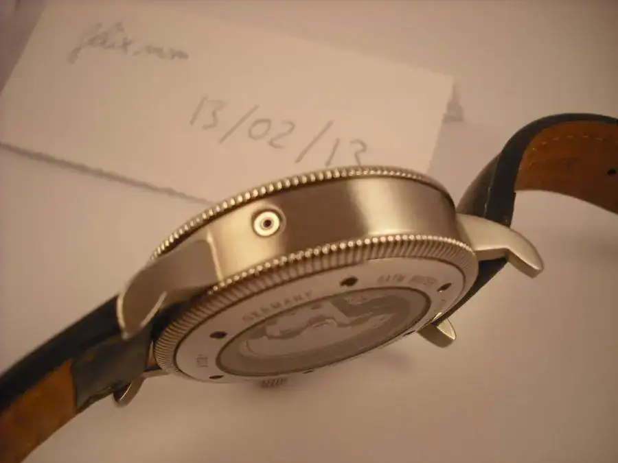 La esfera es blanca con un guilloché plateado, muy espectacular. El bisel va ribeteado, según se ve en las fotos. La corona es similar a la de los flieger más clásicos.