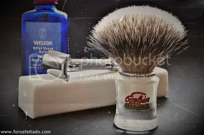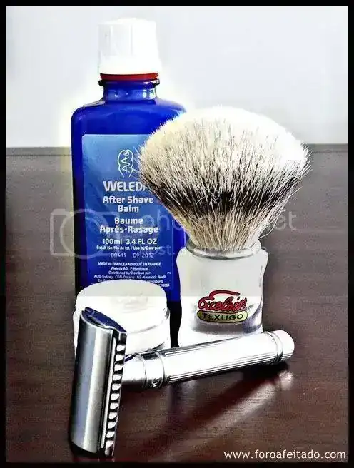 Klar Kabinett jabon/Semogue EL #100 brocha/Merkur HD con Persona Super Blue/444 alumbre/Weleda Balsamo