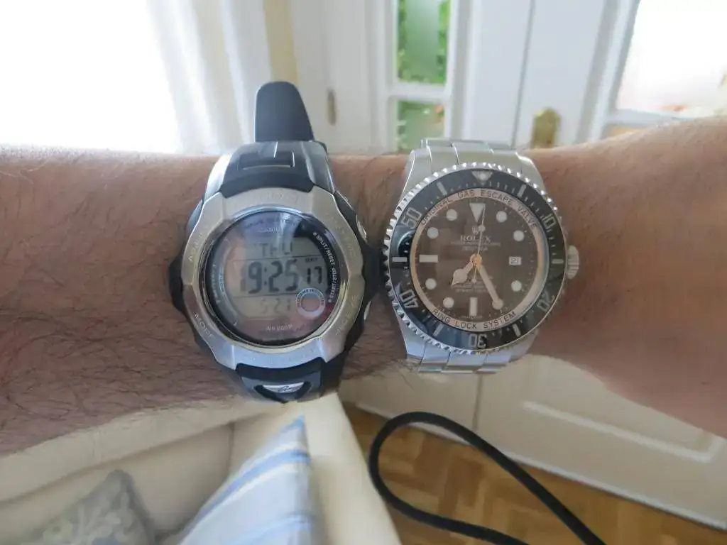 Tuve el placer de compartir mesa en la última quedada RE con el forero Catilina, y entre otras muchas cosas, le comenté mis vicisitudes playeras con los relojes, que incluían, sin ánimo de ser exhaustivo, apedreamientos de DS y oxidaciones de cierre de ploprofs, al hilo de que andaba actualmente buscando un reloj para la playa y el verano, algo tipo casio, una de mis marcas favoritas (y tb de las suyas), con la que poder andar despreocupado por la arena y las rocas.