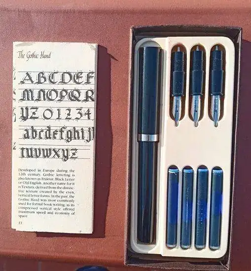 He visto a la venta, por ahí, este mismo set con tres cuerpos, en lugar de solo uno como este. Quizás sea más cómodo que tener que ir cambiando el plumín cada vez que queramos cambiar el tamaño de la fuente, en un trabajo caligráfico. También lo buscaré.