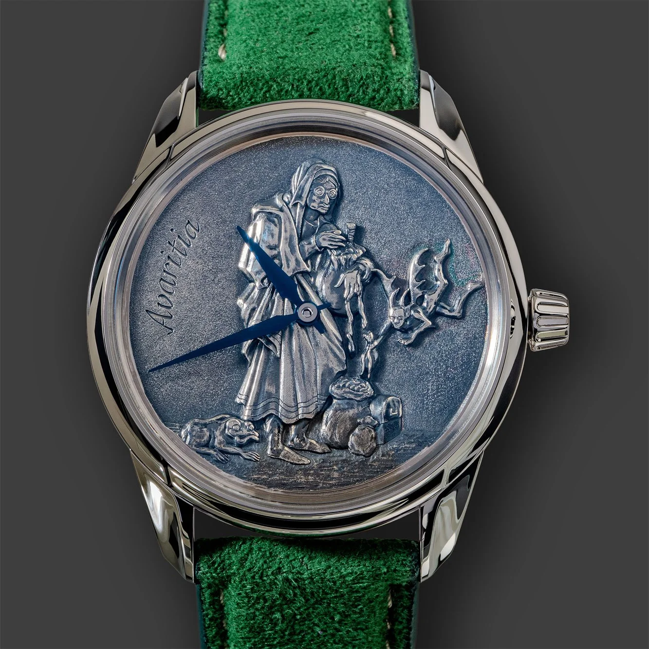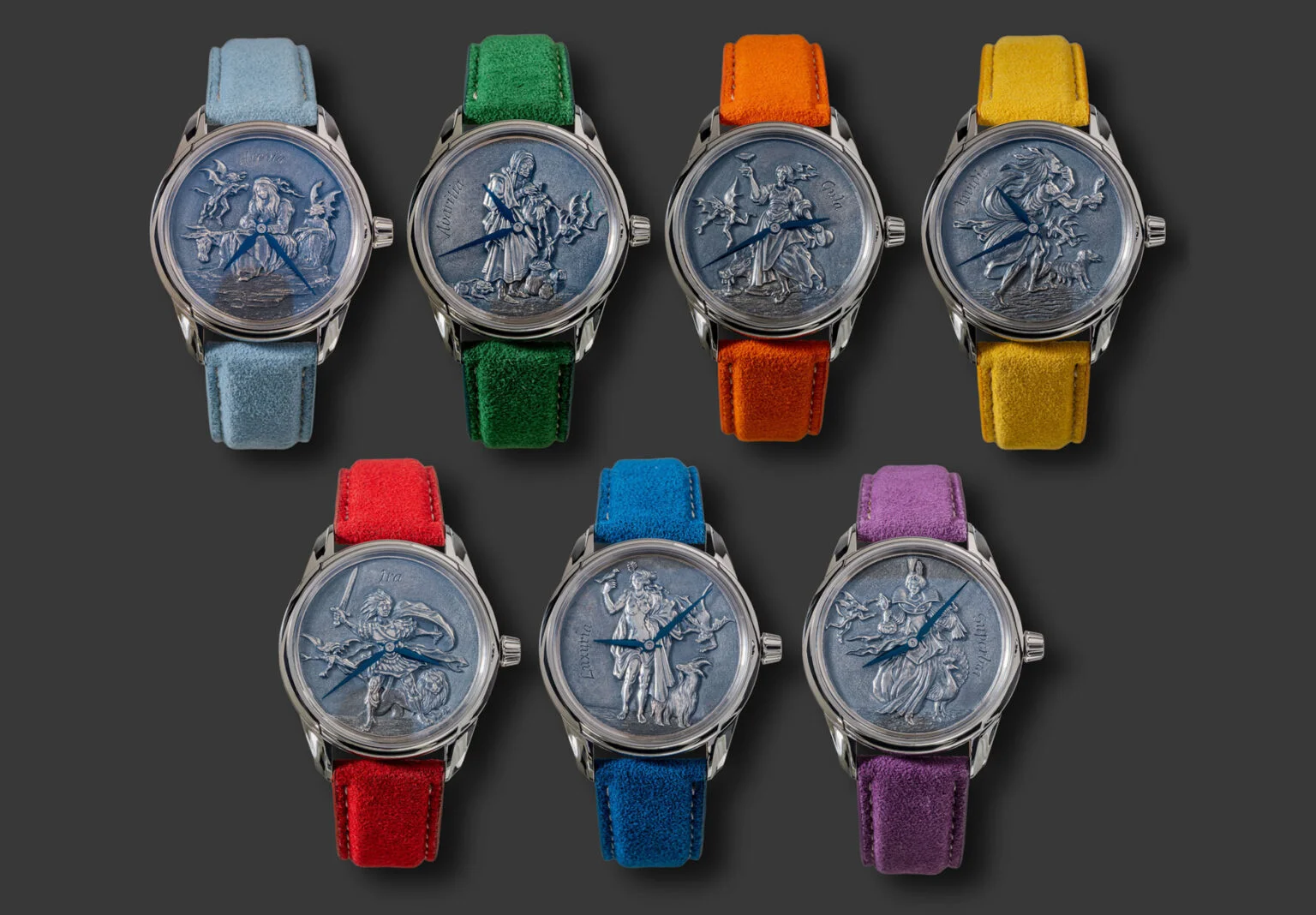 O sea, que trabajo no les falta. Es por esto que me sorprende que se hayan metido en un proyecto de una colección de siete relojes únicos (o siete únicos relojes) cuya particularidad es una esfera esculpida a mano por un grabador también holandés llamado Kees Engelbarts, que ha tomado como base unos grabados del siglo XVII representando los siete pecados capitales. Por lo demás, estos relojes serán todos iguales a excepción de una plaquita sobre el puente del calibre identificando el pecado en cuestión.