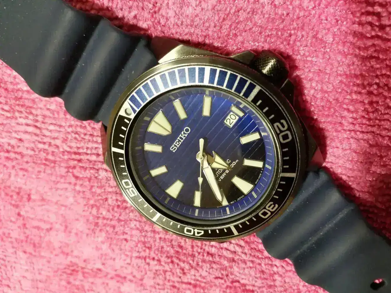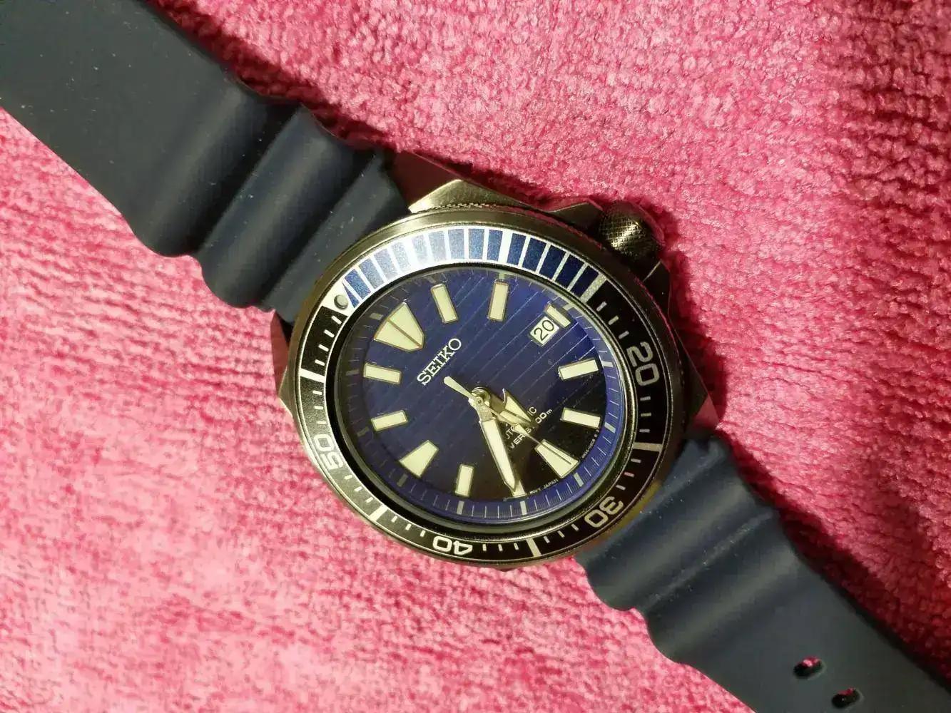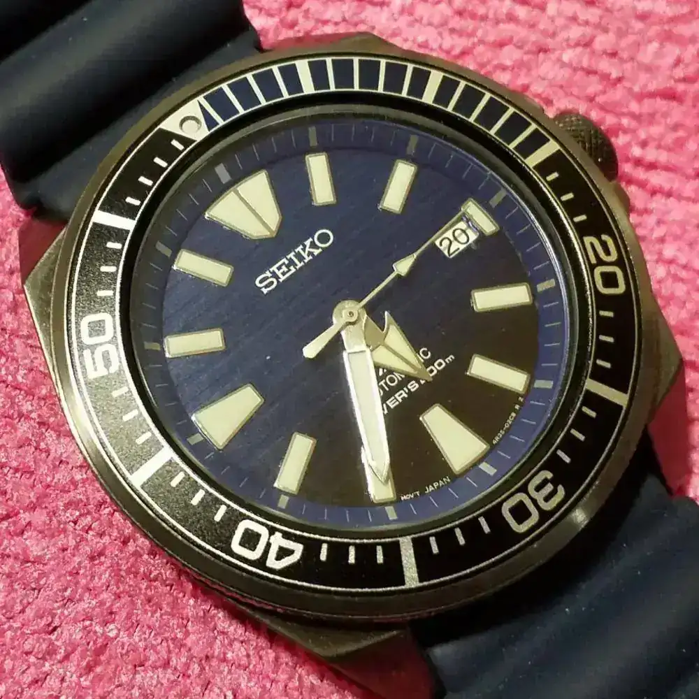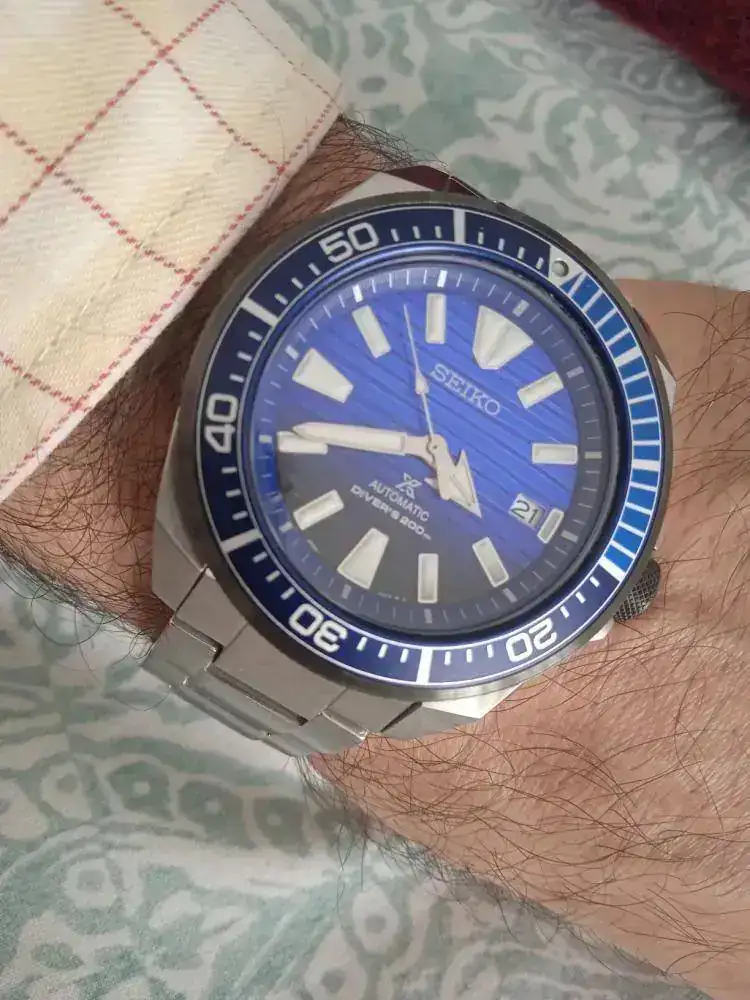 El elegido, un conocido del foro, el Seiko Samurai, en mi caso el SRPD09 "Save the ocean", con acabado en PVD y una esfera en azul, degradándose a negro, que me enamoró el primer día que lo vi.