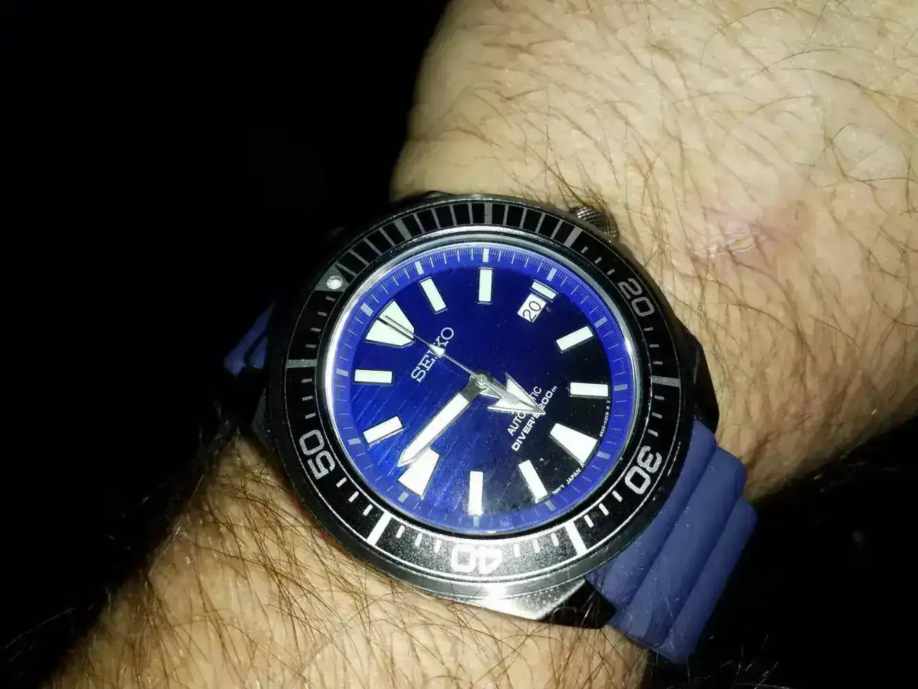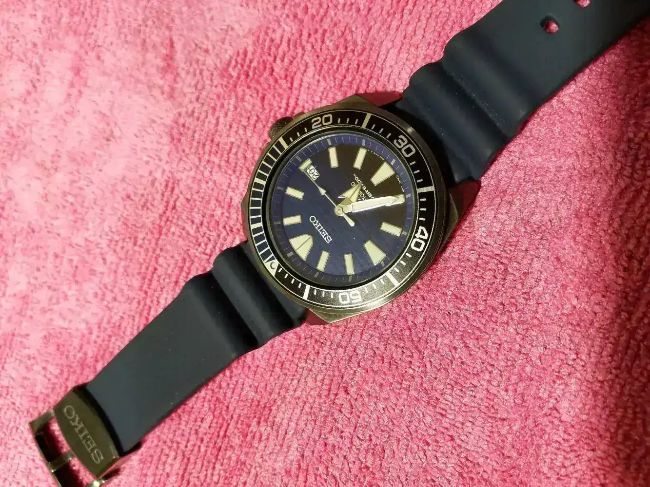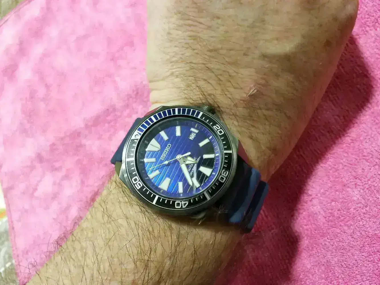 El elegido, un conocido del foro, el Seiko Samurai, en mi caso el SRPD09 "Save the ocean", con acabado en PVD y una esfera en azul, degradándose a negro, que me enamoró el primer día que lo vi.