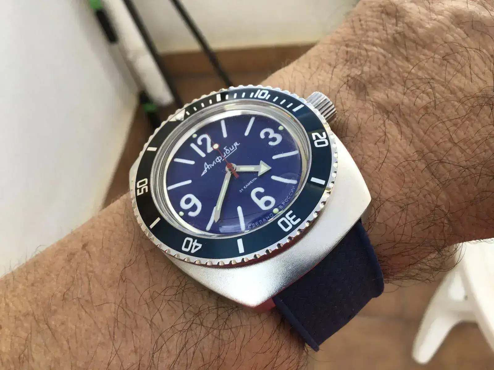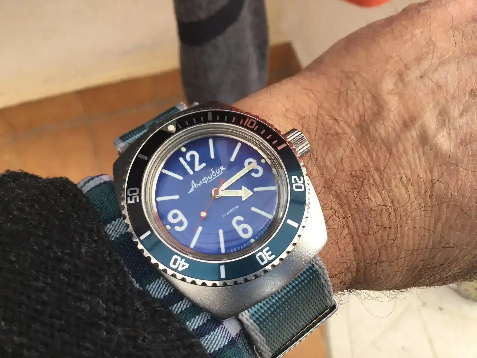En este momento no dispongo de fotos hechas del mismo reloj con el brazalete. Ahora lo llevo con la nato, aunque esta semana me tiene que llegar una nato igual con el color azul parecido al del dial que encontré en Aliexpress porque en Komandirskie las tenían agotadas y además no tienen de este color en su stock. Esta nato se la pondré a un 710 scuba dude, que creo que combinará bien con el color turquesa de su dial, claro que como ya decía un compañero, esta combinación de tres azules, queda bien.