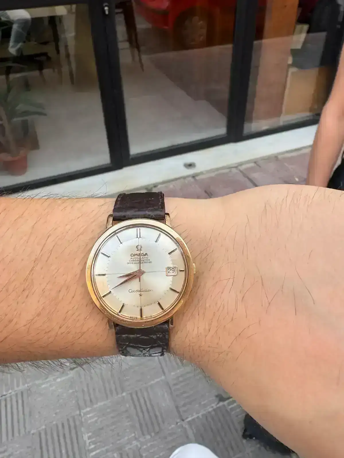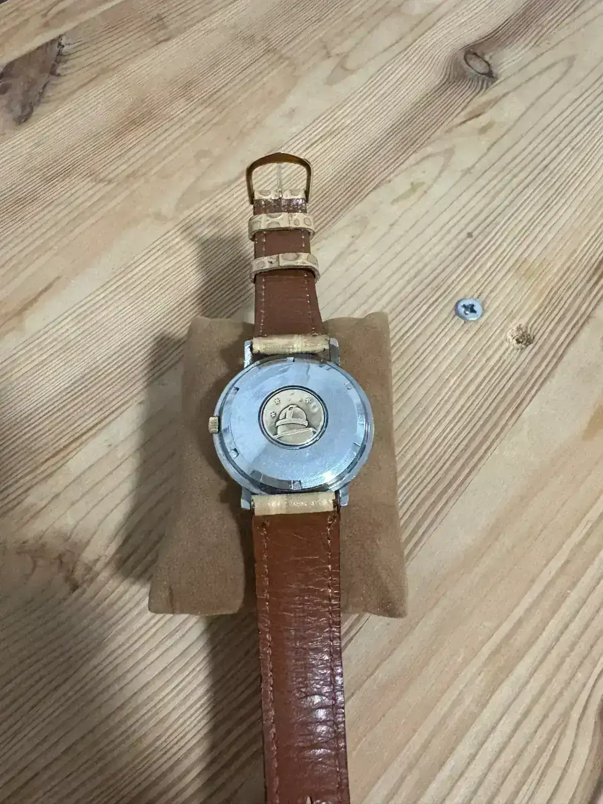 Está algo magullado por el paso del tiempo y el uso, por lo que tendré que hacerle una revisión y, si es posible, cambiarle el plexi, ya que el que lleva no es el original. Aun así, su estado general me encanta. Creo que está completamente de origen, salvo el plexi y la correa. La corona es la de tamaño reducido que montaba este modelo en concreto, un detalle poco común que he visto en muy pocos relojes.