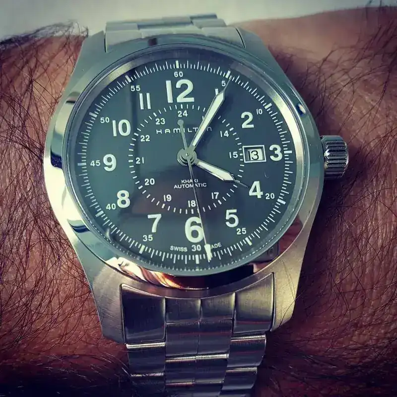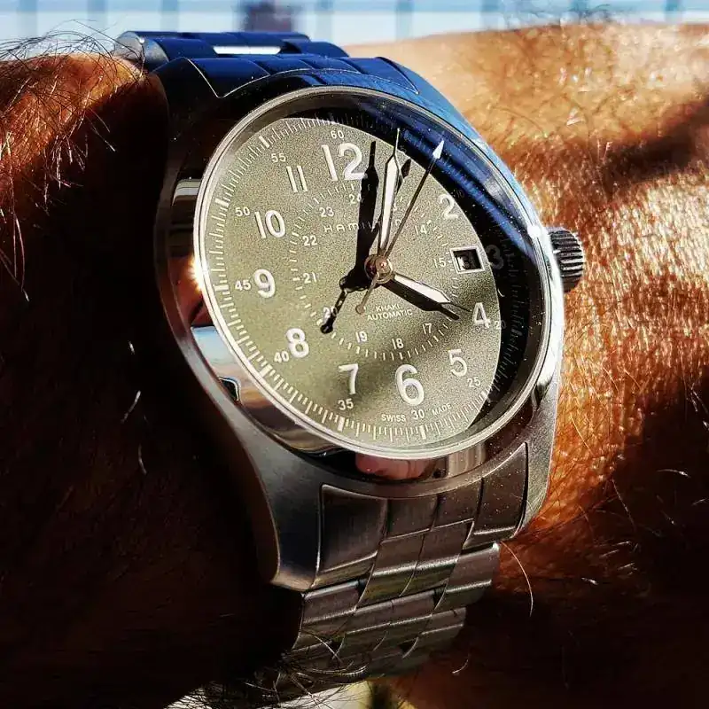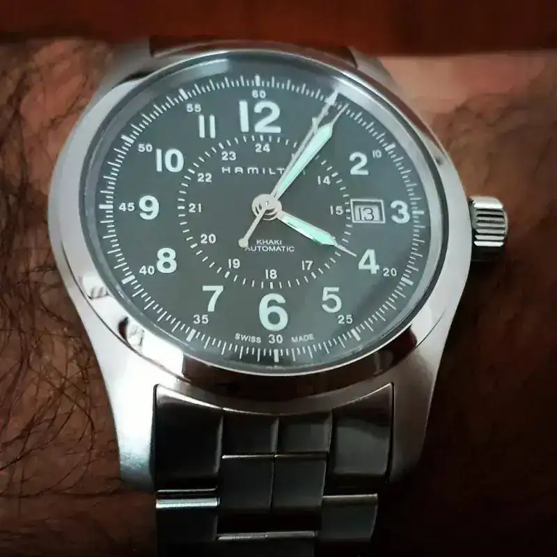Hola, esta vez por fin no se me cruzo ningún otro reloj y me pude comprar un Hamilton que hace rato le tenia ganas,se trata del Khaki Field Automatico de 42 mm en esfera color verde oliva (en las fotos parece algo grisácea pero es verde mate) 100M, con su calibre H10 y sus magnificas 80hs de RM, Ref. H70605163.