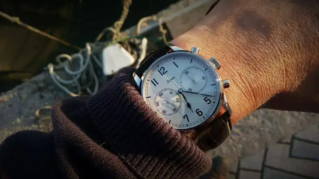 Su esfera, no es blanca, sino plateada, siguiendo el mismo procedimiento de fabricación de los IWC. Las agujas son azuladas al fuego, no coloreadas con químicos y son realmente espectaculares. Su caja con las asas largas (fabricada por la prestigiosa Fliker) es pulida completamente a espejo) y con un tamaño de 41mm no se hace para nada pequeña en la muñeca, es más, diría un reloj casi contundente.