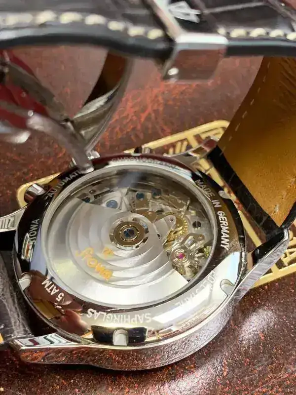 El calibre que lleva el Stowa se trata del fiable y preciso Valjoux 7753 en grado Top, decorado, con los tornillos azulados y el logo de la compañía grabado en oro. Su trasera de zafiro, nos permite ver el acabado del calibre. (la foto es del compañero Hoyanco) En este caso Stowa a prescindido de la fecha y de una subesfera, a mi parecer con acierto, creando una gran armonía en su conjunto (a veces menos es más)