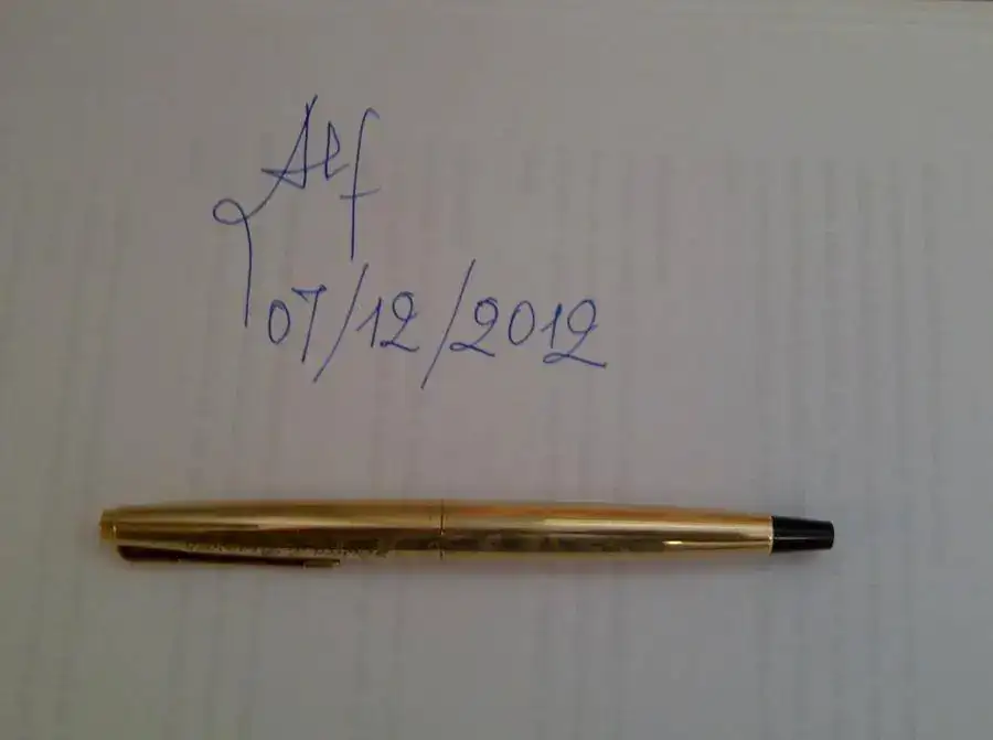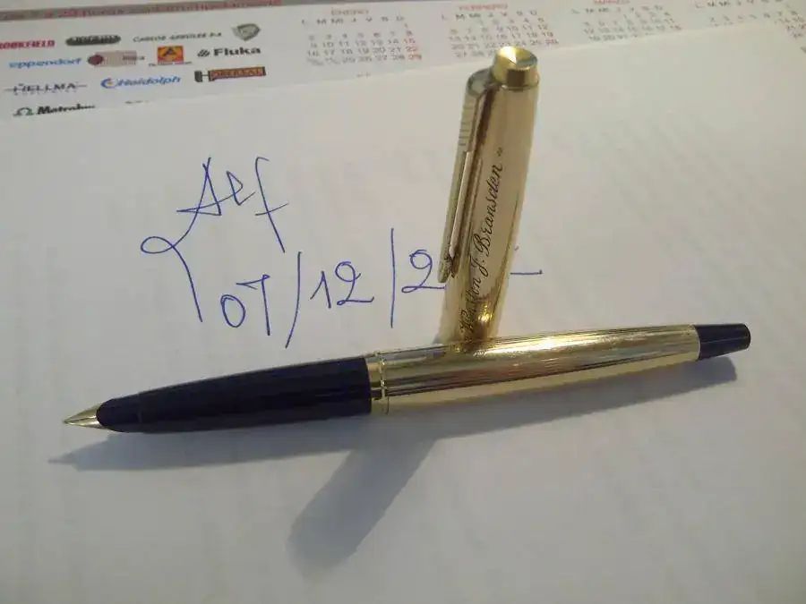 Chapada en oro, capuchón grabado con el nombre de su anterior dueño ( un americano lamado Winston J. Bransden). Plumín de oro, carga por cartucho, estado buenísimo. Punto F tirando a EF, Escribe muy bien.