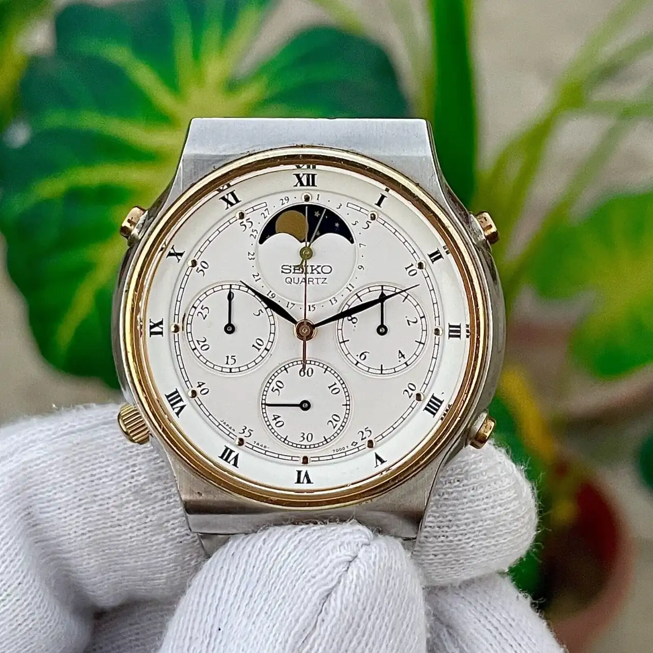 Hola a todos, acabo de comprar por wallapop esta curiosidad. El crono no resetea a 0 pero me llama la atención que además del crono con minutos, segundos y centésimas tenga fase lunar. Es un quarzo y me imagino que llevará un calibre de quarzo eta pero cuál? Alguna idea del modelo o características ? Gracias y un saludo .