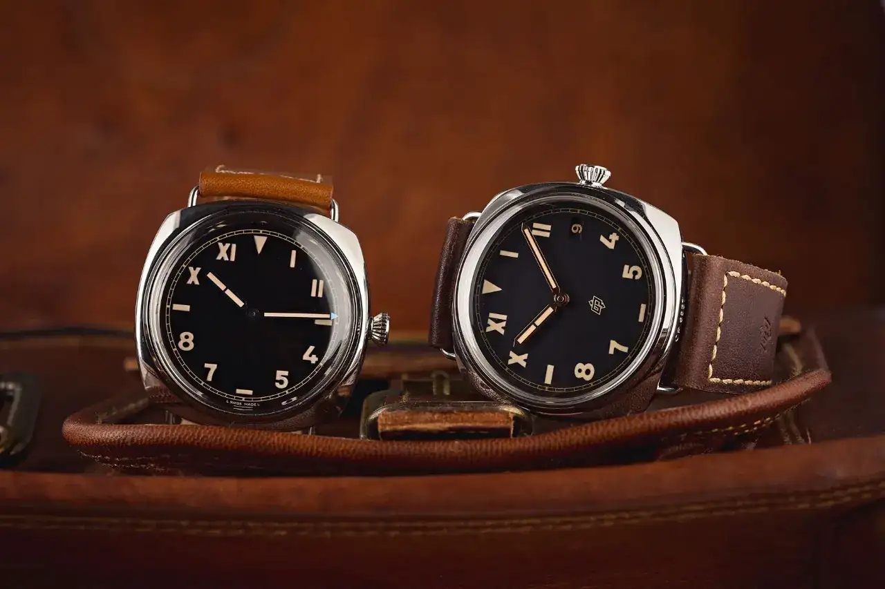 Pues parece un Panerai Radiomir antiguo 1930-1950 de cuando montaban movimientos Rolex en algunos relojes.