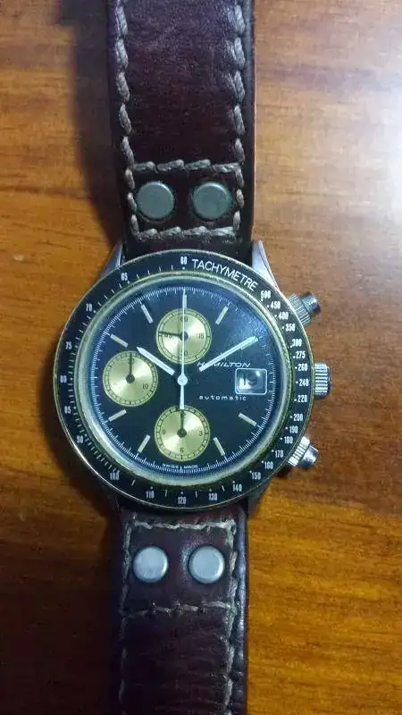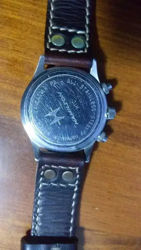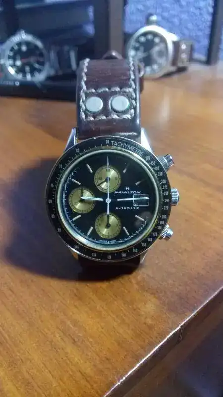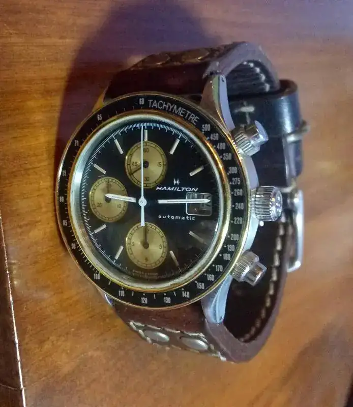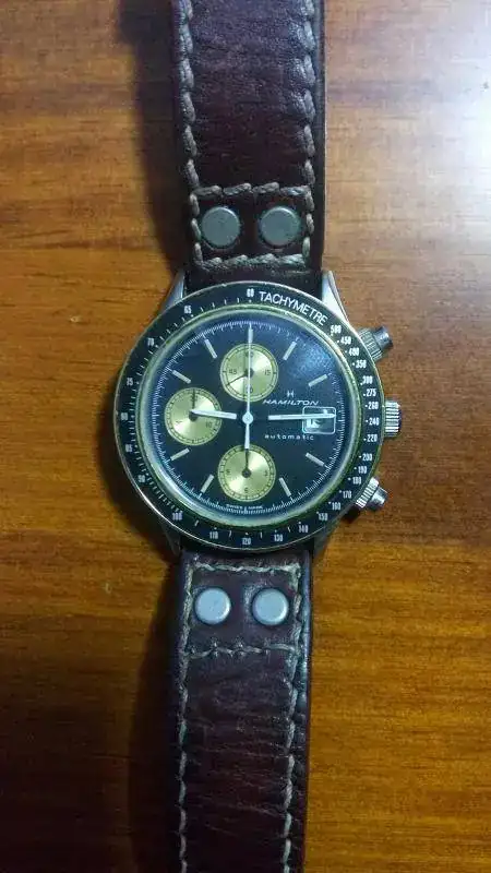 Creo que es un hamilton de finales de los 80 principios de los 90,previo a la adquisición de la marca por el grupo swatch.es decir de la época aún americana de la marca.elcrono montau un valjoux 7750 y es de los ensamblados en Suiza.Creó que tu modelo es el de 38,5 mm de diámetro con pulsadores a rosca. La correrá no es original
