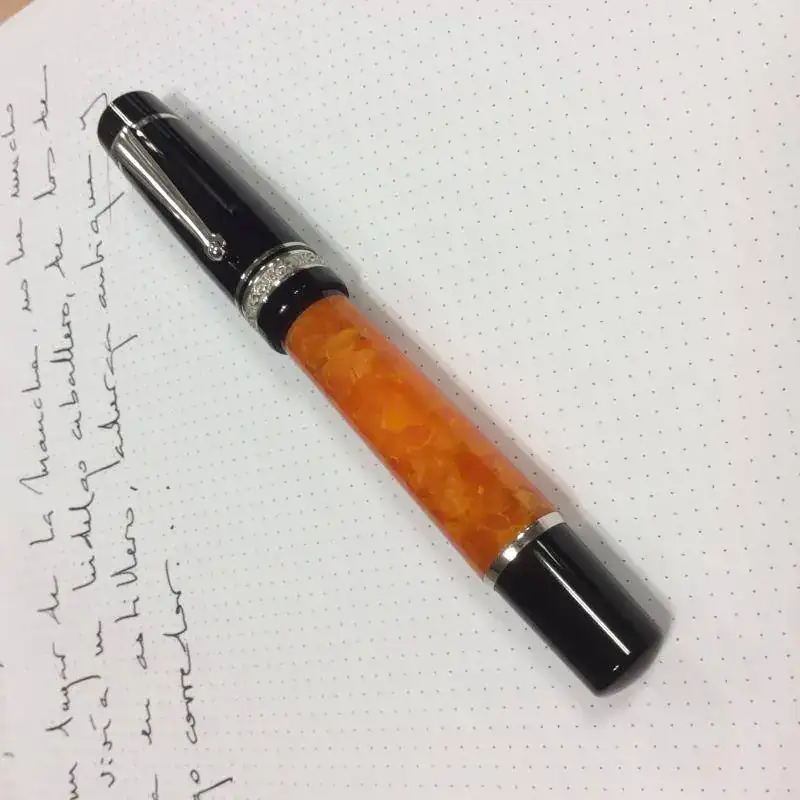 Nikolass, te parafraseo "keep calm", je. La acabo de poner en un botecito con agua y fairy como me enseñó este foro hace años. Después de limpiarla bien la entintaré. Mi letra es todo más que horrorosa, pero prometo decir qué me parece. Una cosa, el alimentador ha llegado un poco desalineado, un toquecito con mucho amor y todo en su sitio. La sensación de subir y bajar el émbolo es de una calidad excelente, a la altura de Montblanc y Pelikan o incluso mejor. En el recorrido hacia arriba no hace tope, sino que se desplaza como una carraca, lo cual es una muestra de seguridad. Espero que escriba tan bien como la pinta que tiene a la mano. La resina sencillamente fantástica.Muestra de escritura y primeras impresiones de la misma por favor...