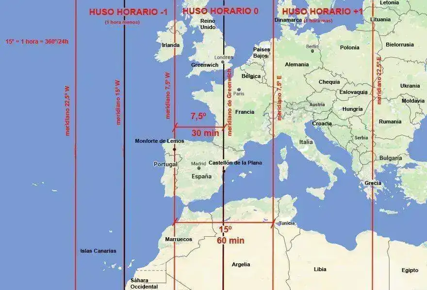 Aquí nos pasa algo parecido. En España tenemos el mismo huso horario que París (el horario central europeo). Sin embargo, Portugal que hace frontera con España por el oeste, tiene lleva el horario de Greenwich; es decir, una hora menos. Y este meridiano (Greenwich es el mismo que pasa por el Este de la península, y el que le correspondería a España. Así que la mayor parte de la España penínsular está en un huso horario desfasado una hora; y esto ocurre desde el 16 de marzo de 1940, cuando el dictador Franco decidió cambiarlo solo por agradar a Hitler. Parece que nadie se ha interesado en volver a la normalidad del huso horario que verdaderamente le corresponde a esta gran parte de la península.