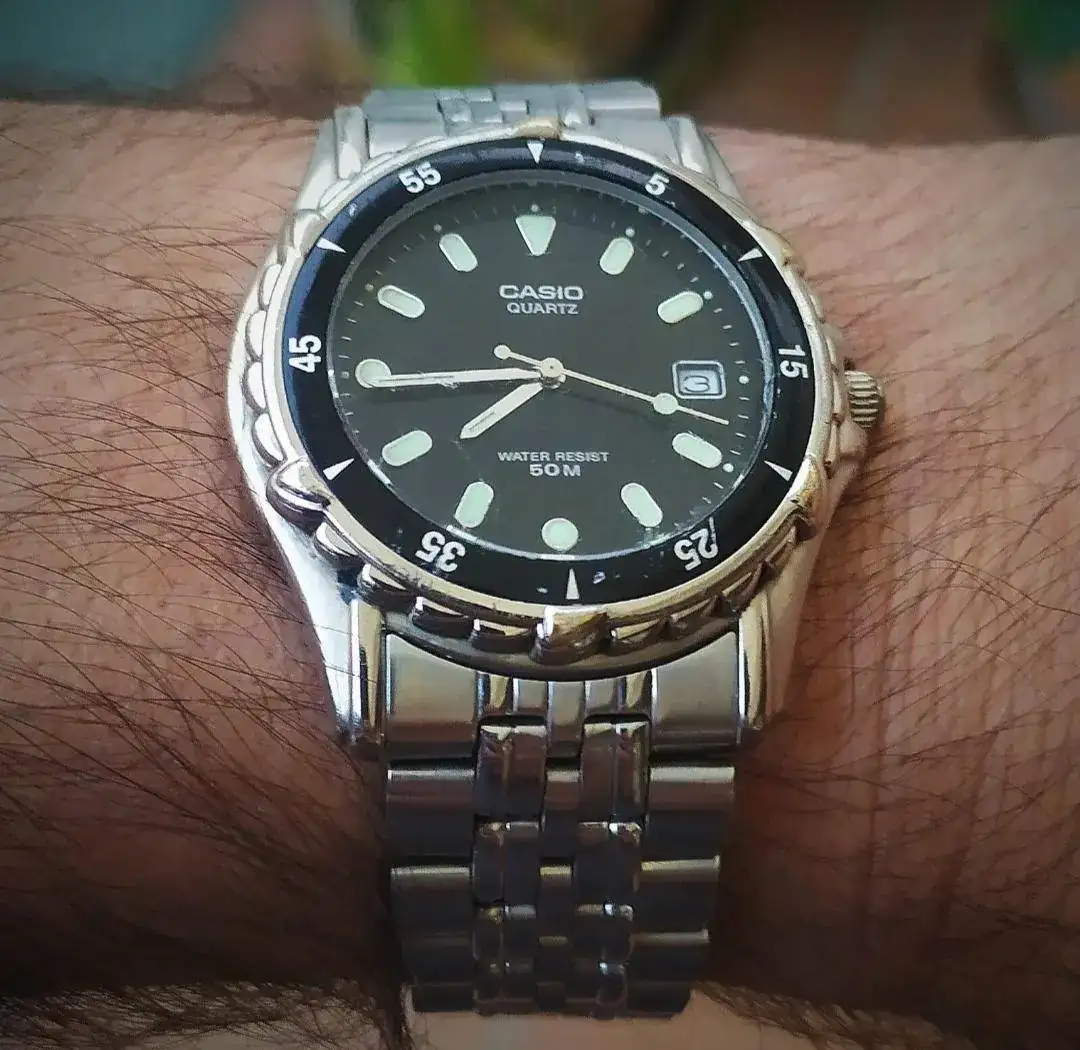 Por suerte, amigo, siempre por suerte. Bien guapo ese Casio!. Yo también conservo mi primer reloj, nunca pensé que formaría parte de una colección cuando me lo regalaron hace...buf!...casi cuarenta y cinco años. Ahí sigue el Orient como el primer día, aunque mi afición llegó bastantes años después.Por suerte o por desgracia ya tengo 45 jureles. Llevo desde los 15 años. Mi primer reloj fue un Casio. Que todavía conservo funcionando a la perfección.Ver el archivos adjunto 2696193