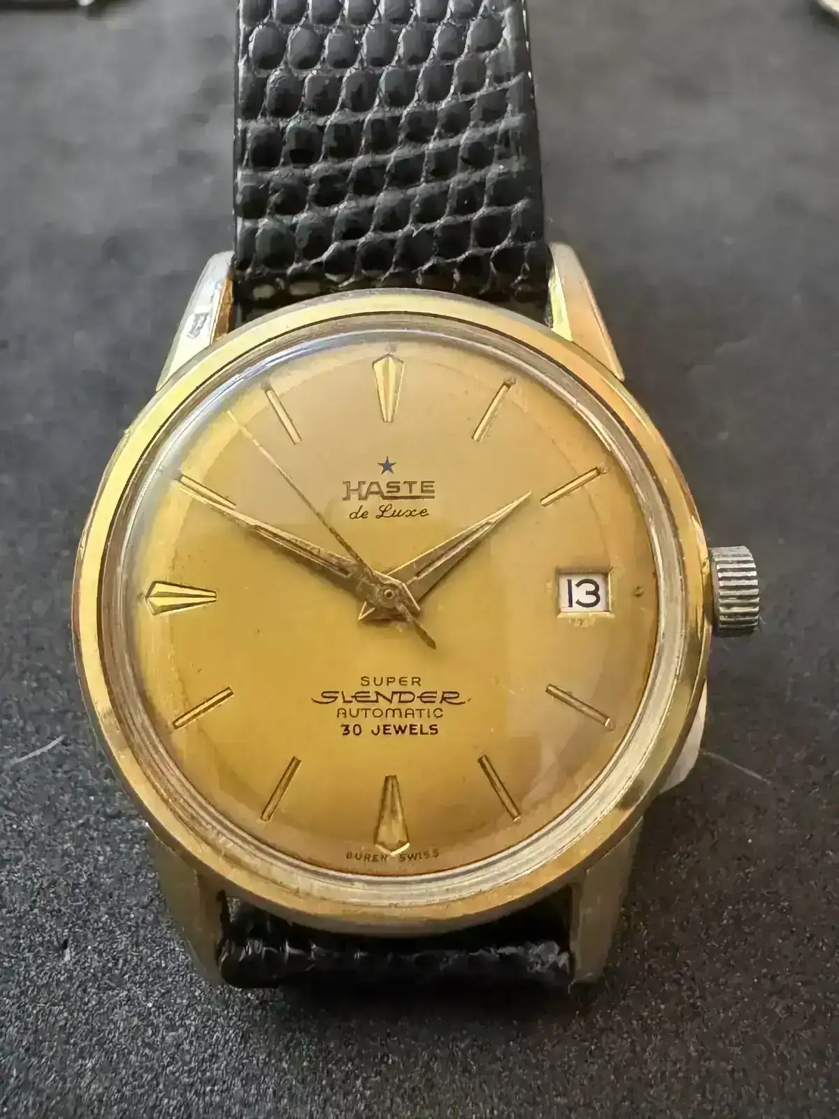 Este es un reloj Super Slender de la marca Haste, que ensambló relojes en México. Cuenta con un movimiento automático Buren micro rotor, específicamente este movimiento se fabricó en la década de los 60´s. En la parte inferior de la carátula (a las 6) se puede leer Buren Swiss, los índices son aplicados y la ventana de la fecha tenía un marco (este no lo tiene) como se puede observar en el promocional en el siguiente enlace https://mexicovers1.blogspot.com/2007/03/haste-super-slender.html?m=1