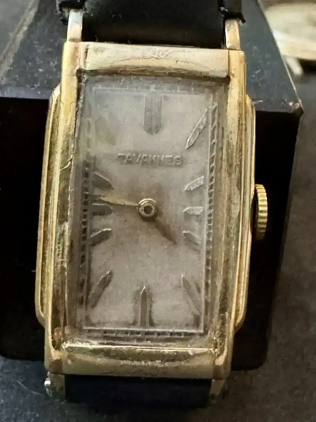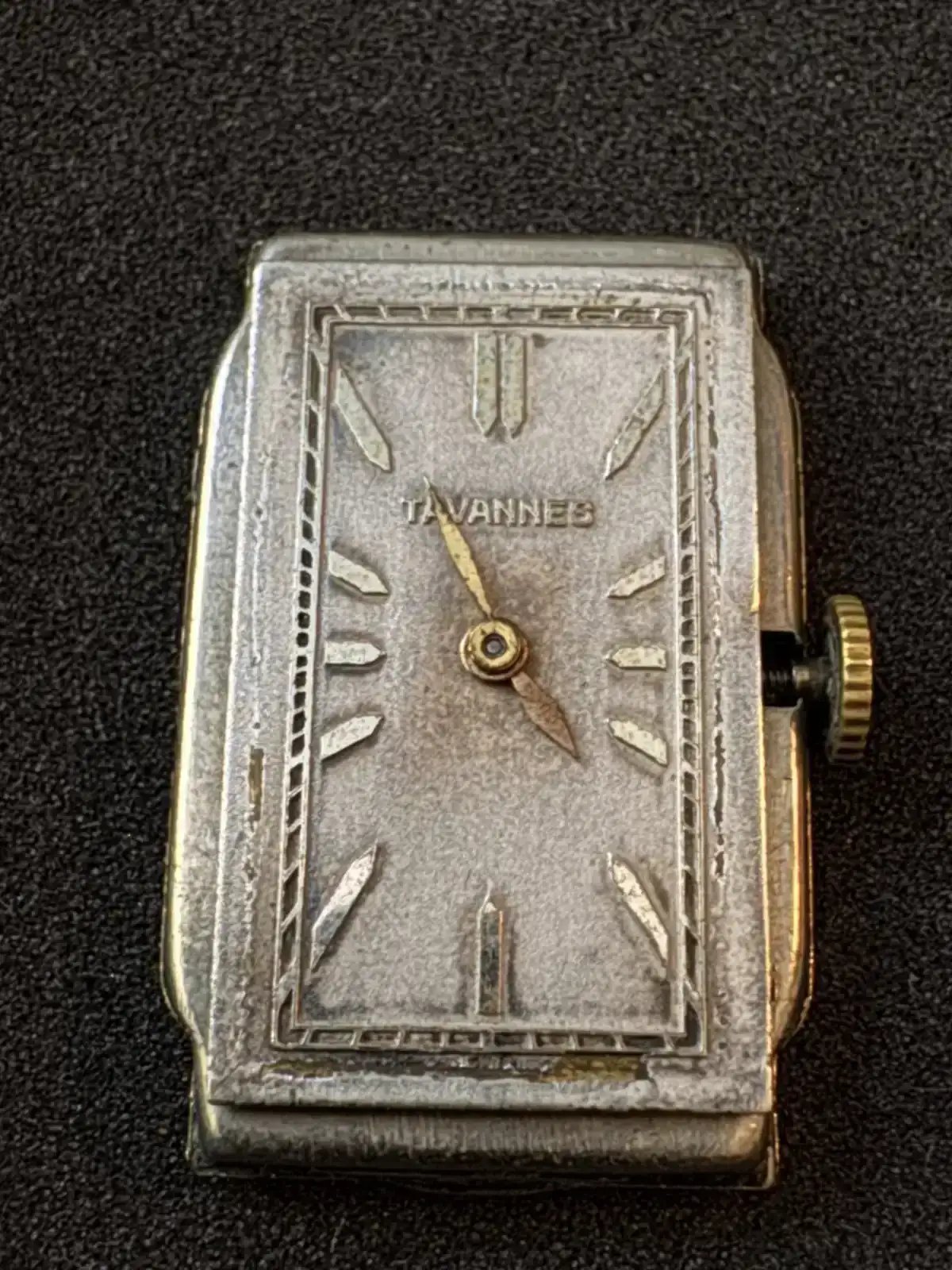 Es un Tavannes con caja rectangular laminada en oro de 10K y adornos en los laterales. La carátula tiene índices aplicados y solo cuenta con dos manecillas.