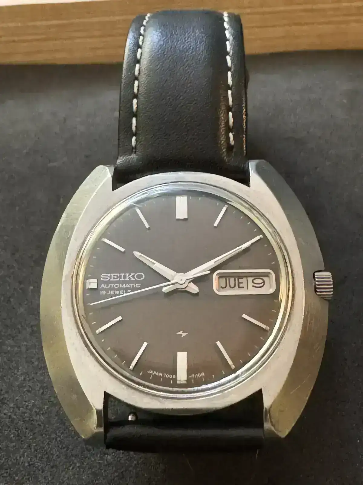 La carátula parece tener un color gris antracita con una franja más obscura entre las 9 y las 3, a las 6 tiene la leyenda JAPAN 7006 – 7110R y a las 9 se puede leer la leyenda pintada SEIKO AUTOMATIC 19 JEWELS. Los índices son aplicados y a las 3 tiene la ventana para el día y la fecha con un marco. La primera posición de la corona sirve para ajustar solamente la fecha y en la segunda posición la hora. La caja es de acero inoxidable con tapa trasera a rosca y la leyenda 7006-7020. En el siguiente enlace presentan la reparación de un reloj similar. https://www.thewatchsite.com/threads/seiko-7006-7020-restoration.344326/