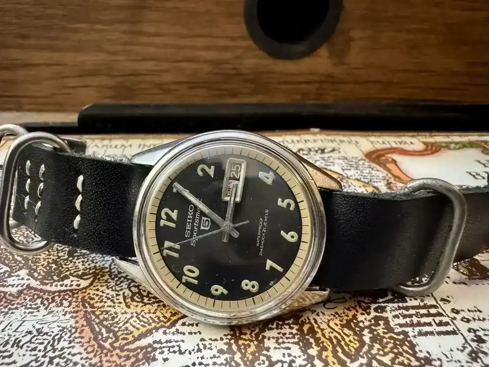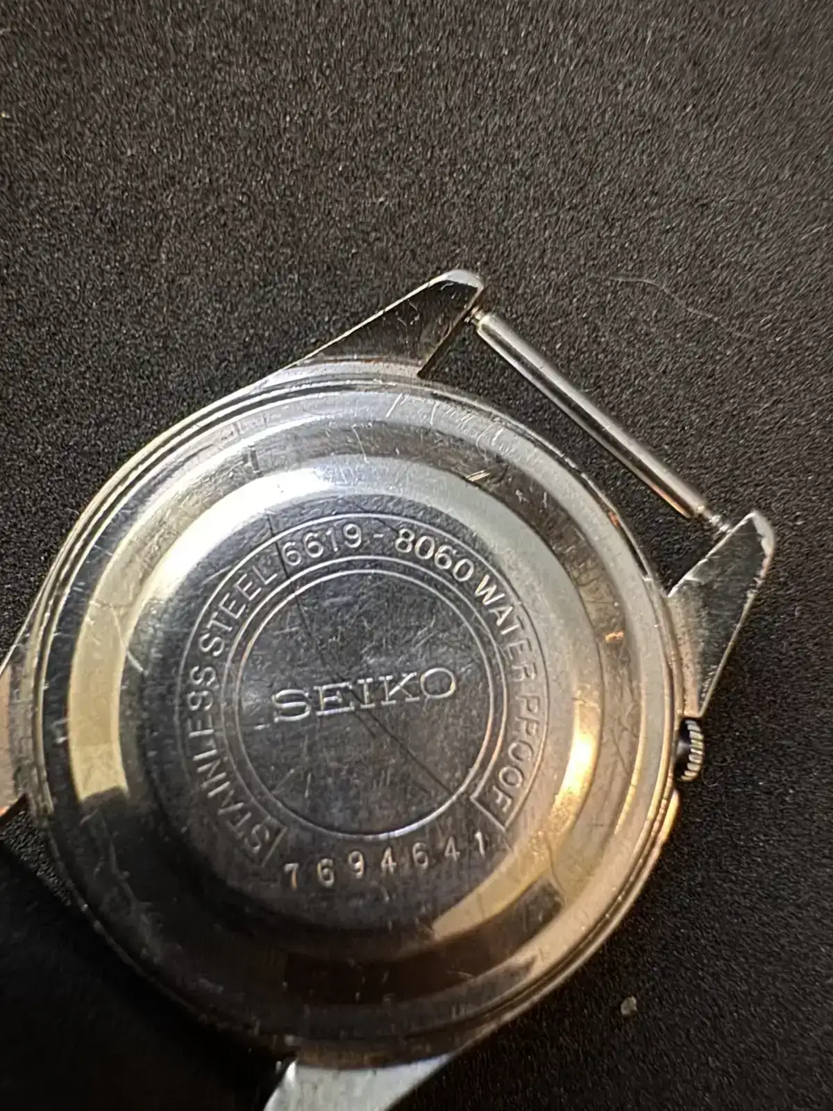 Seiko Sportsmatic 5 ref 6619-8060. La carátula es obscura con índices de números arábigos con pasta luminiscente, al parecer es tritio. Este tiene un aro dorado donde están marcados los minutos, probablemente no corresponda al modelo ya que los que he visto el arillo tiene el mismo color de la carátula. La corona oculta se encuentra a las 4, es muy pequeña y un poco incómoda para ajustar la hora. Al pulsarla se puede cambiar la fecha. Este reloj es similar a los utilizados durante la guerra de Vietnam, por lo cual también se encuentran como Seiko MACV-SOG (Military Assistance Command Viet Nam – Studies and Observations Group). En el siguiente enlace se puede encontrar más información referente a esos relojes https://www.dcvintagewatches.com/pr...W50kQO22gox72nYjOmbfN6r6CYYCi2efoYZQ3b2ZXTn4j