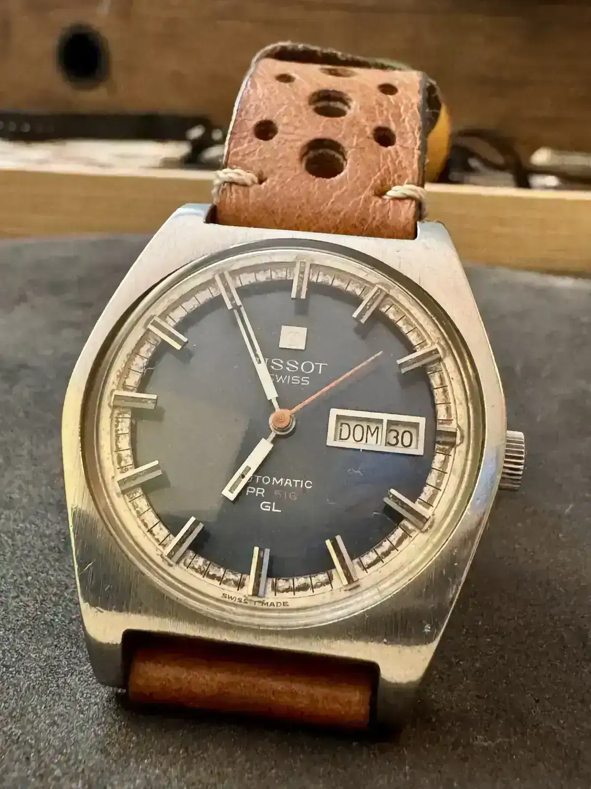Tissot PR 516 GL ref 46572 con caja de acero y corona firmada. Creo que la referencia 46672 corresponde al modelo con brazalete integrado. Ver referencia https://blogskycorner.wordpress.com/2023/12/08/1972-tissot-pr-516-gl-cal-794/ Para mi esta versión es más practica ya que permite cambiar la correa. La carátula es azul con una pequeña placa a las 12 con el logo de Tissot. Cuenta con ventana para día y fecha con marco metálico que los separa. Cuenta con un anillo donde están montados los índices y las manecillas pasan por debajo de estos.