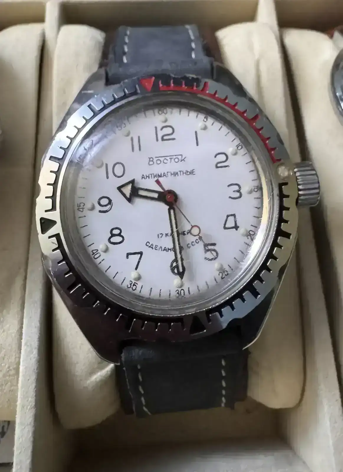 Vostok" Amphibia komandirskie de cuerda. Dial Balnco con índices arábigos impresos y puntos de material luminiscente. Bisel bidireccional, corona roscada. Manecillas con material luminiscente y segundero rojo tipo lollipop con material luminiscente. Al desenroscar en la primera posición se puede dar cuerda y en la segundo ajustar la hora.