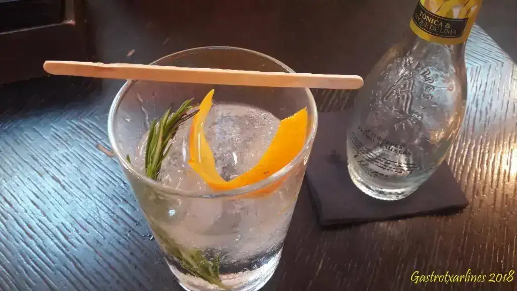 Unos hielos en vaso de sidra, corteza de naranja, rama de... ¿romerooo?, botella de tónica llena para que te lo eches tú y, la guinda, palo de polo para que te lo remuevas...