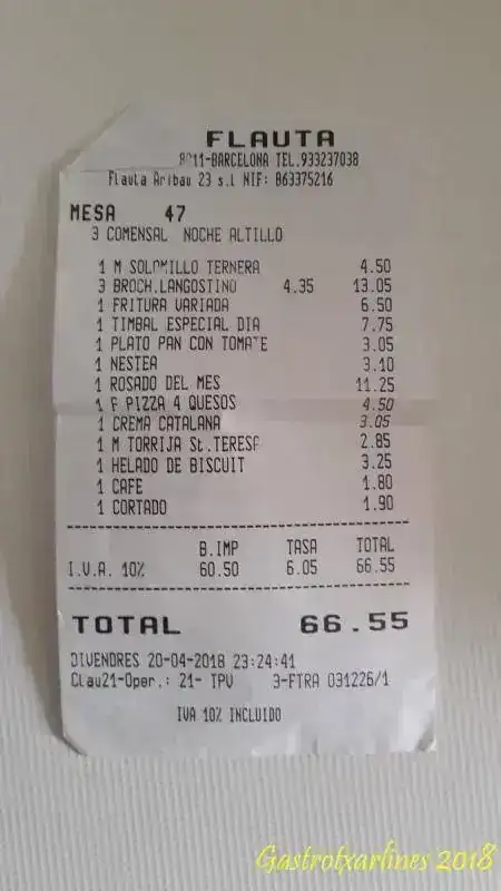 Uno de mis fijos cuando voy a la ciudad condal es el restaurante LA FLAUTA, en la calle Aribau, paralela a la calle Granados (de un ambiente de copas y terrazas que da gusto, porque está muy cerca del jaleo de Paseo de Gracia y de La Rambla de Cataluña pero a la vez se puede tomar una copa y alternar con toda tranquilidad sin que te tarden un cuarto de hora en servirte y te claven lo que os mostraré más tarde.