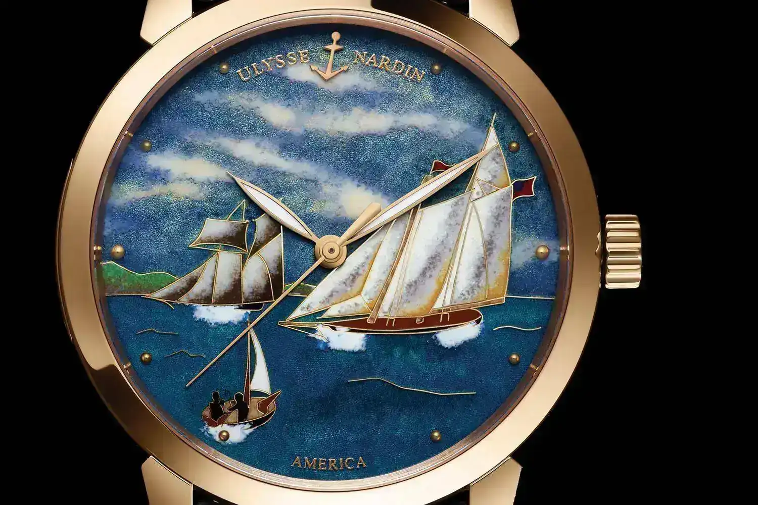 La esfera, pintada a mano totalmente, nos muestra el primer velero « América» ganando la denominada -Jarra de las 100 guineas- del Royal Yacht Squadron's en 1851, posteriormente se cambió el nombre de la competición de veleros y de su trofeo por -Copa América-.