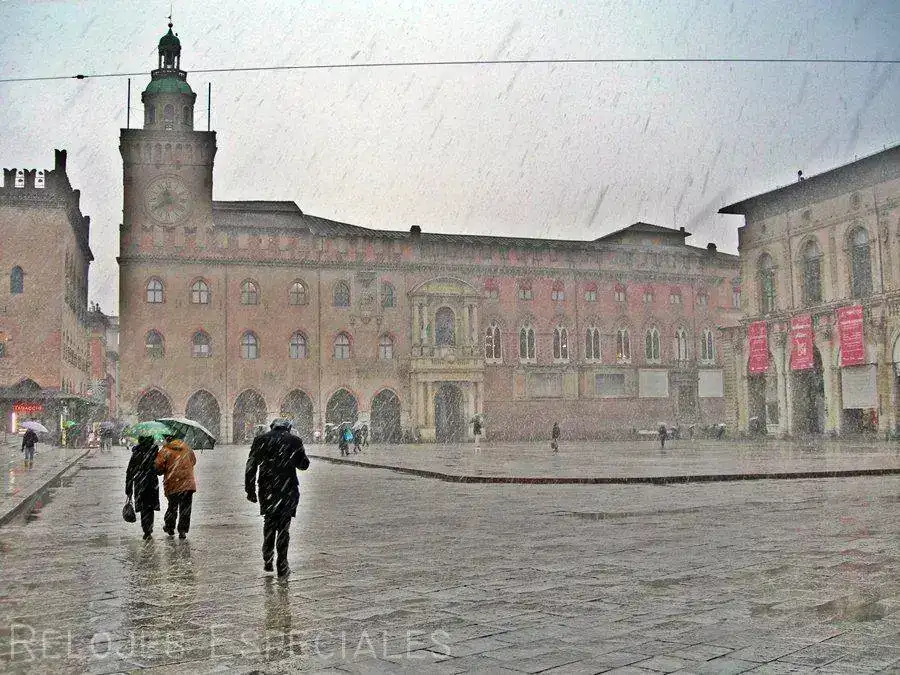 Lo de la nevada no es un decir: esta es la Piazza Maggiore, sede del Comune o ayuntamiento. Esos grandes relojes de torre son fascinantes.