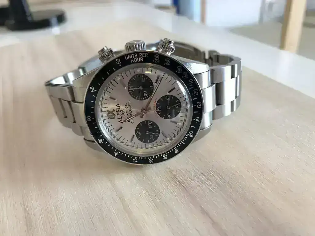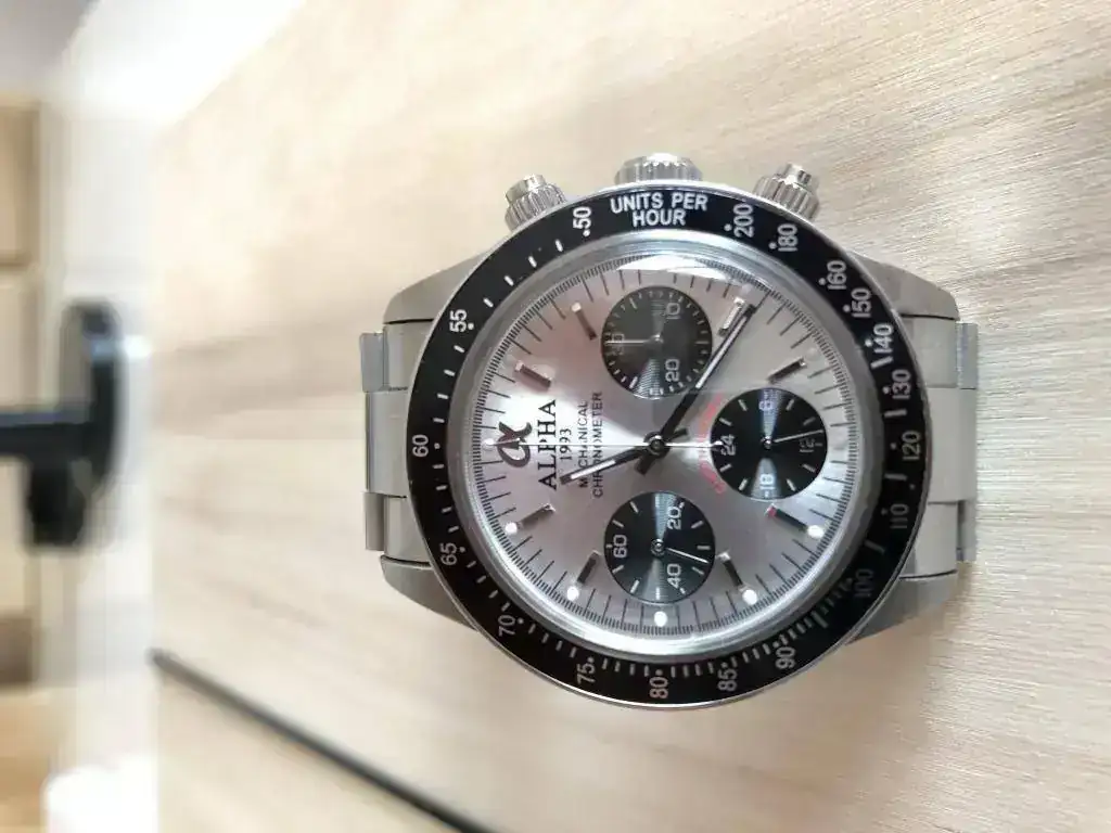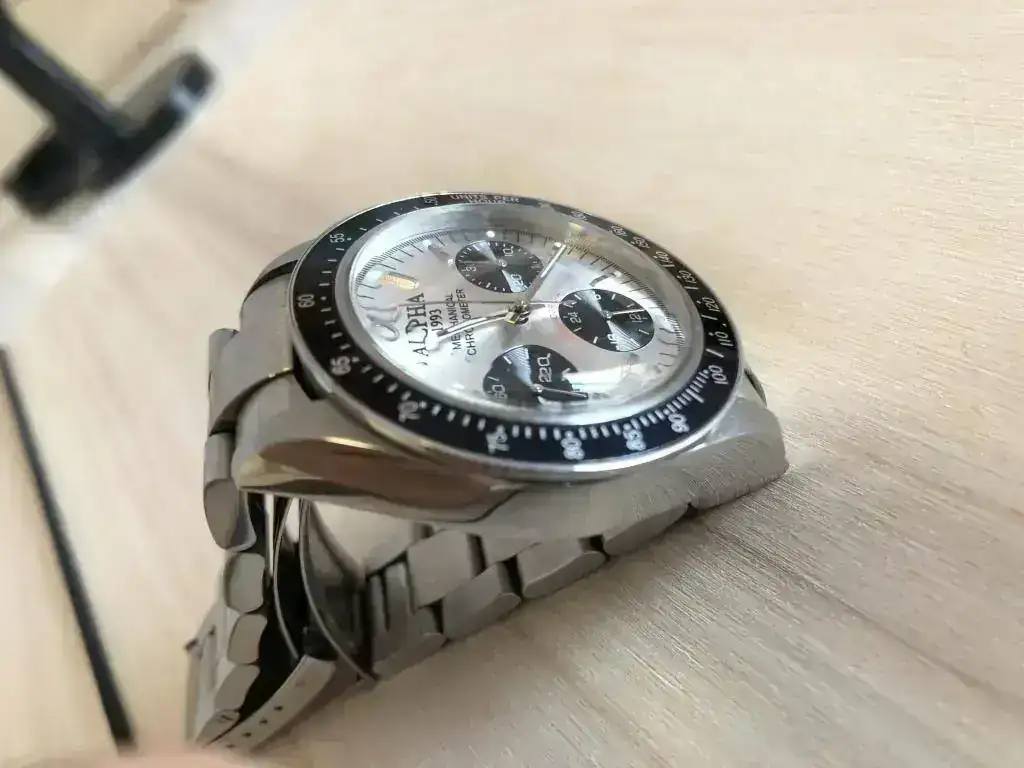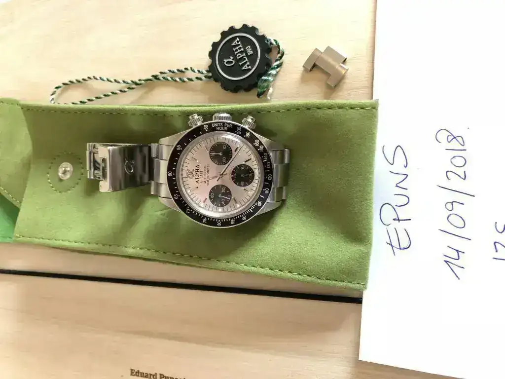 Adquirido a un compañero en este mismo foro. Se trata del Alpha "daytona" big red. Con cristal plexy abombado y esfera plateada.