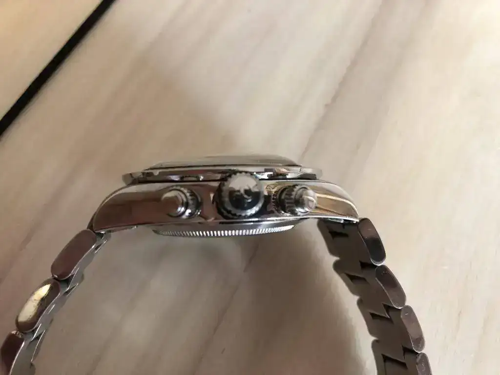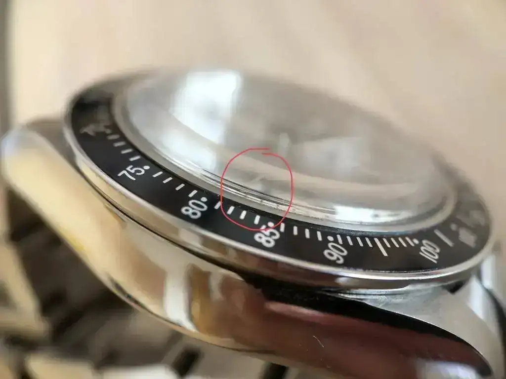 A destacar, en el plexi (a la altura de las 9) tiene una pequeña marca no profunda. Creo que con una pasada de PolyWatch se iría (ver foto con "macro"), y la funda de piel esta manchada de SuperGlue (ver fotos también).