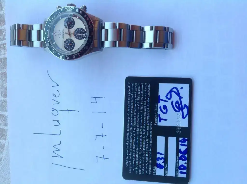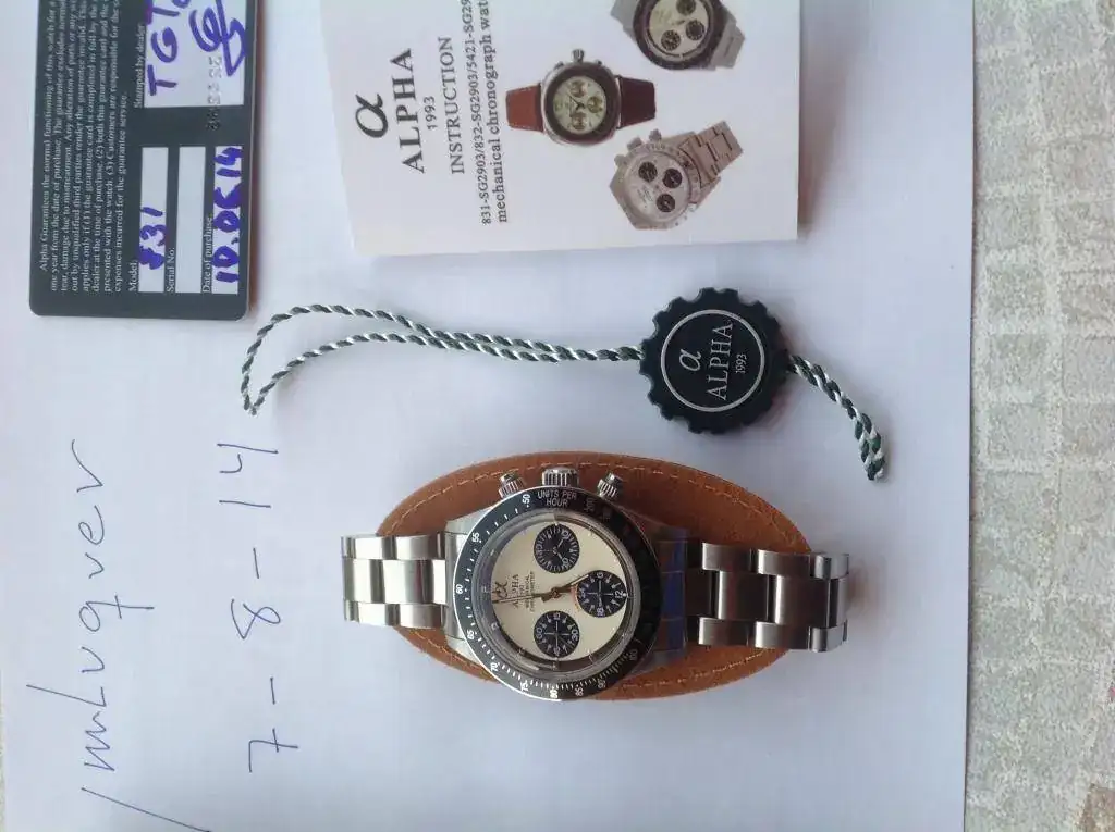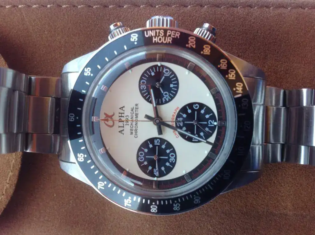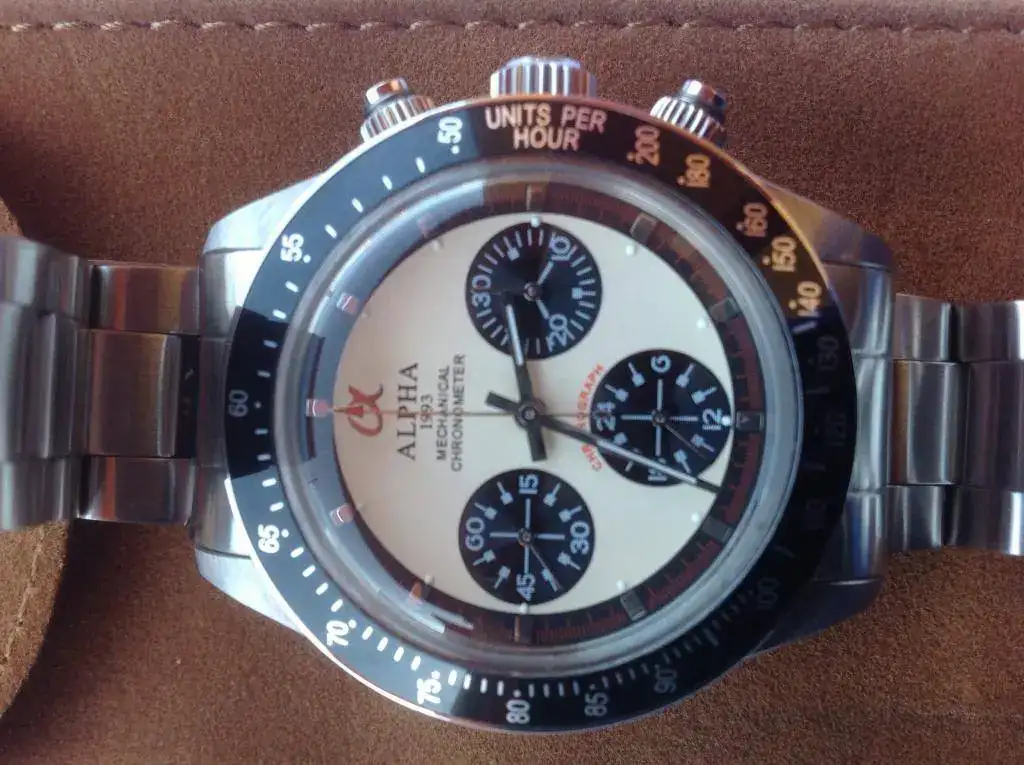 Buenas tardes: saco a la venta ALPHA DAYTONA "PAUL NEWMAN" dial crema. No hace falta mucha presentación para este reloj. Caja de acero de 39 mm, armis, plexi abombado y con el calibre ST19 que se puede apreciar porque la trasera es vista. Garantía de once meses de la marca Alpha, recibido hace un mes, me lo he puesto en un par de ocasiones. El reloj me encanta pero me lo veo pequeño para mi muñeca de 19 cm y viene otro de camino.