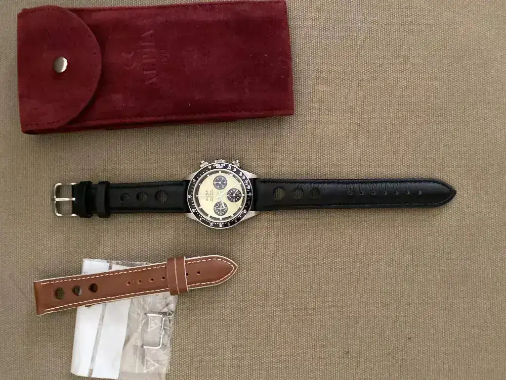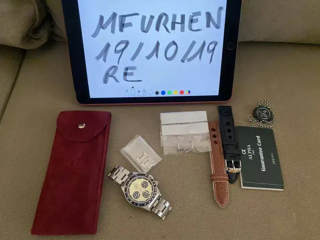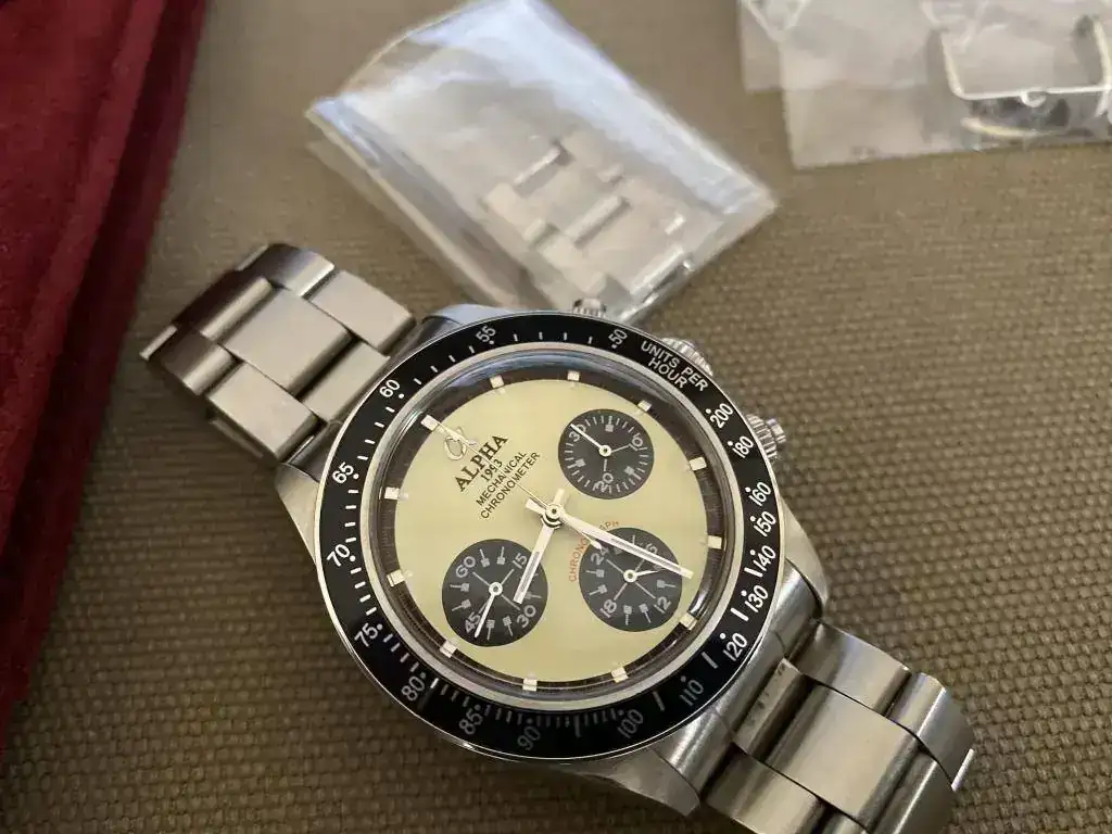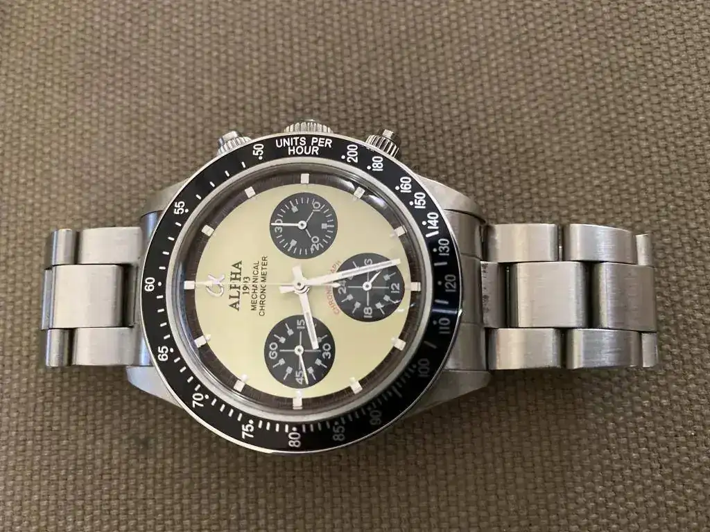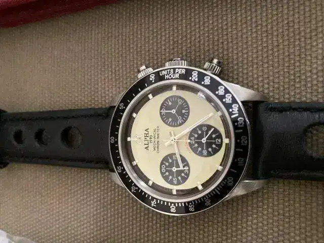 Vendo este archiconocido Alpha watch, modelo Paul Newman en un estado excepcional. Este modelo es una réplica del que a día de hoy es el reloj más caro del mundo, el Daytona de Paul Newman. Esta en un estado excepcional como digo, apenas alguna leve e inevitable marca ya que ha tenido mínimo uso. Para los que no lo conozcan es un cronómetro mecánico de cuerda movimiento Seagull, lo que le da un toque aún más vintage. Monta un bonito Cristal plexi abombado.