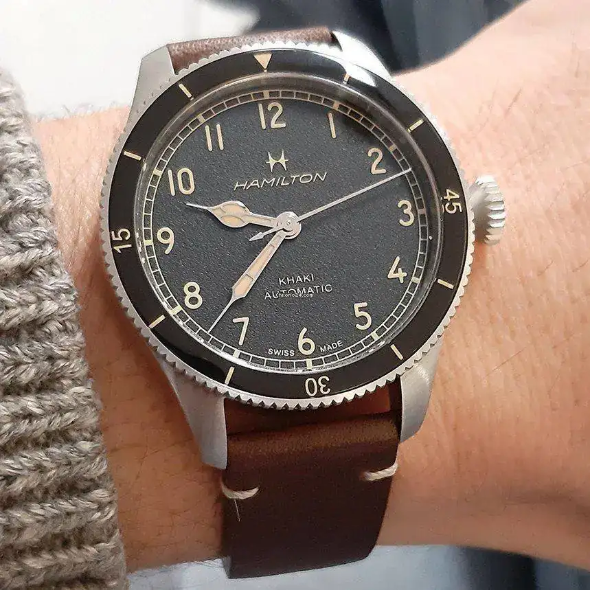 Es verdad que a este reloj las fotos no le hacen justicia. Es mucho más bonito en vivo.¿Y si te liamos un poco más y en lugar del Murph optas por otro Hamilton H-10, con agujas catedral, esfera negra, inspiración militar y 38mm? Khaki Aviation Pilot Pioneer H76205530