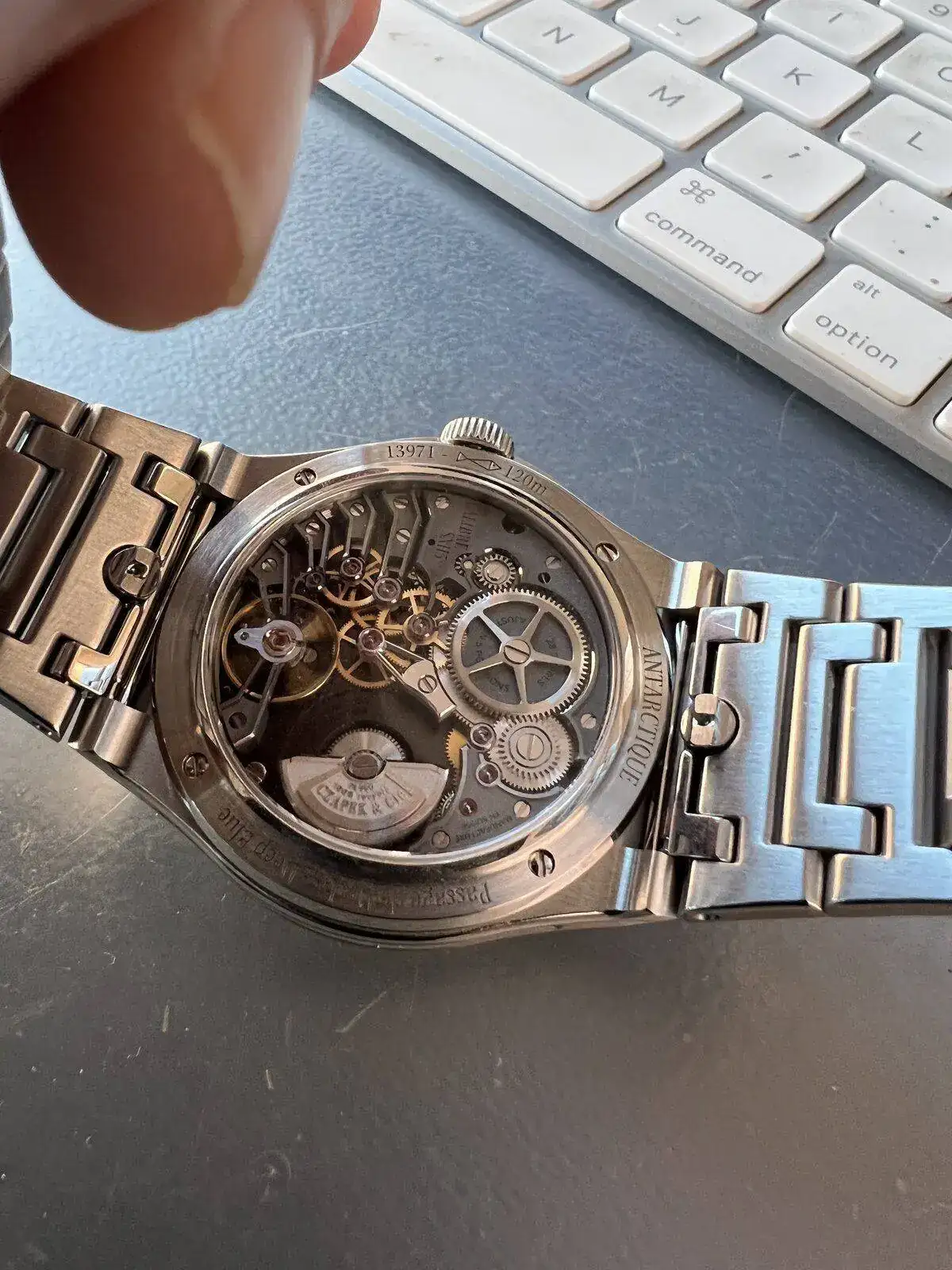 De ninguna manera, sólo comento que cada vez me convenzo más de que un IWC debe estar en la colección. Siendo franco, el único reloj que creo que podría considerar como una alternativa o comparar con el RO, es el Nautilus. Y para mí, en lo personal, el RO de 41 mm es el reloj perfecto: el guillocheado grande tapisserie me parece fibonacciniano, el bisel tipo escafandra, el moviento visible, las manecillas de oro blanco. Azul, gris o verde, no tiene comparación, casi nada le falta (lo único que le reprocho es que no sea al menos 200 mts de resistencia al agua). La corona es hermosa y ese brazalete es único... quitárselo para ponerle uno de goma o de tela sería anatema. Es el único reloj que yo creo que no customizaría con otra correa. A los dichosos portadores del RO ya sea en acero o en oro, mis más sinceras felicitaciones porque tienen quizá el reloj más revolucionario de la historia de los relojes de pulsera (excepto por Casio).